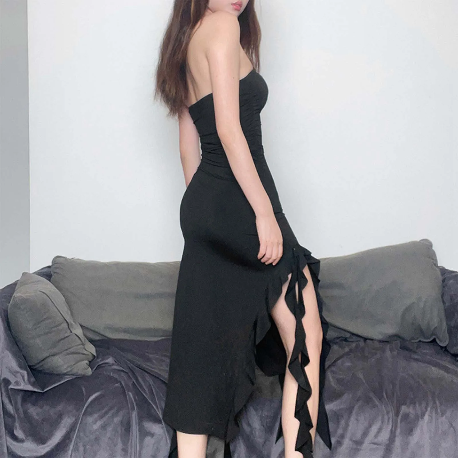 Elegant Strapless Dress Women Irregular Tassel 2024 Summer Trend Skinny Split Maxi Bodycon Birthday Party Clubwear