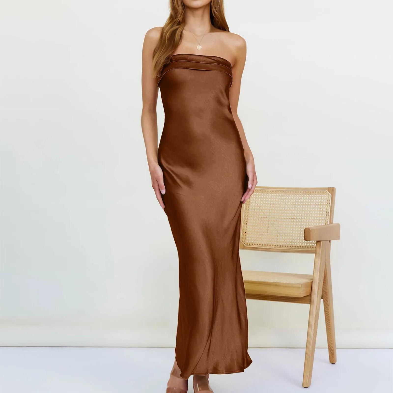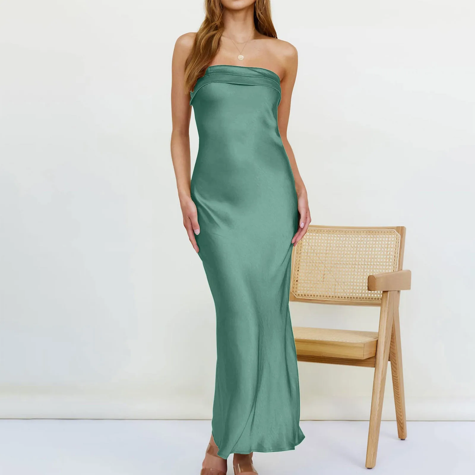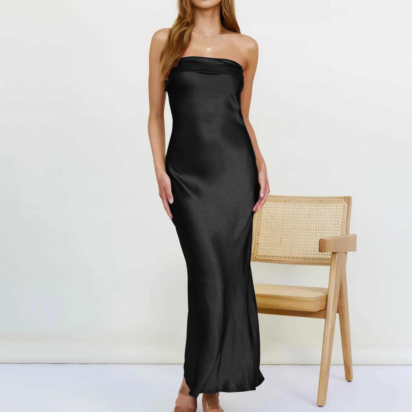 Lady Silk Elegant Maxi Dress Womens Stunning Incline Shoulder Backless Sleeveless High Street Robe Concise Girls Evening vestido
