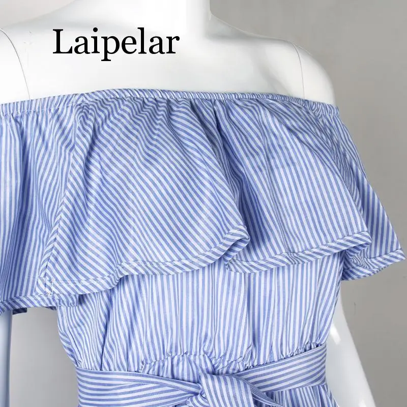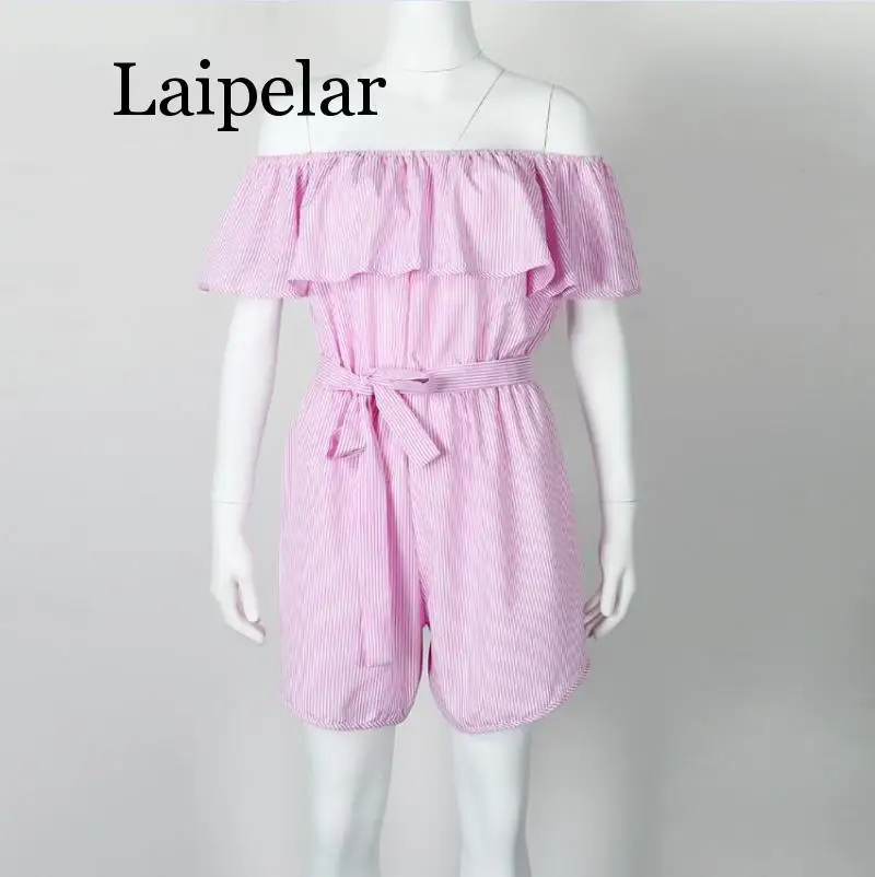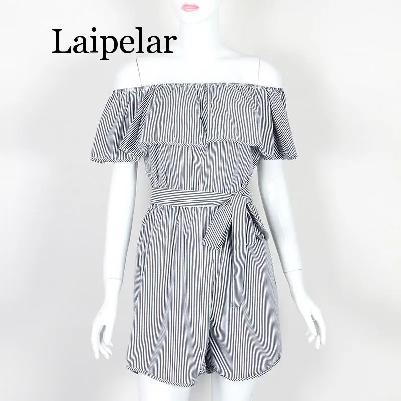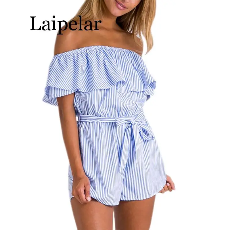 Ruffles Slash Neck Beach Playsuits Summer Women Striped Jumpsuits Girls Sexy Casual Playsuit Overalls With Belts Femininos