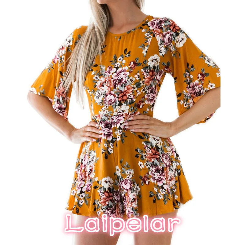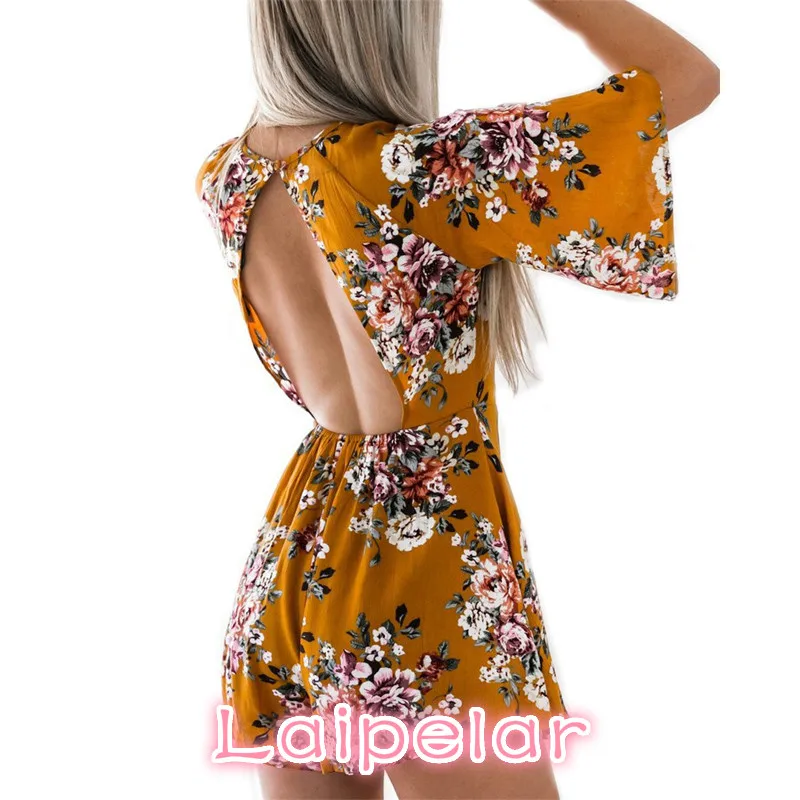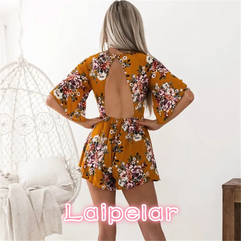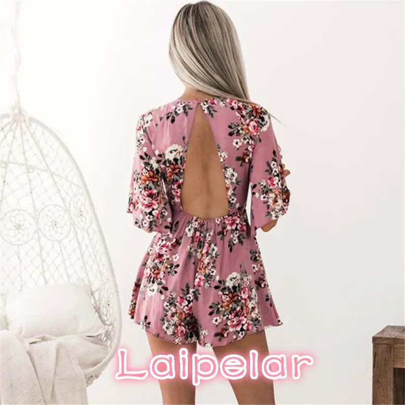 Summer Boho Style Women Rompers Floral Print Beach Playsuits Sexy Backless Jumpsuit Female Short Chiffon Jumpsuit Overalls