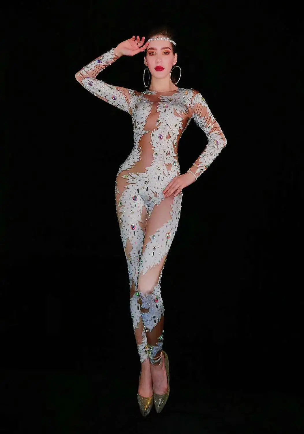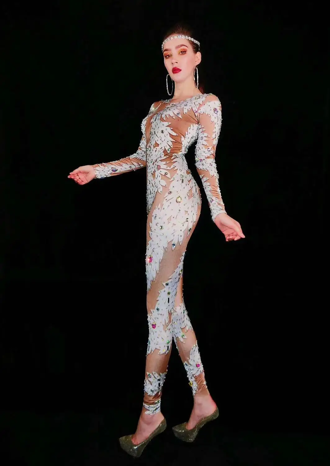 Fashion Rhinestones Jumpsuit Elastic Legging Crystal Rompers Sexy Stage Costumes Women Nightclub Party Singer Dancer Bodysuits