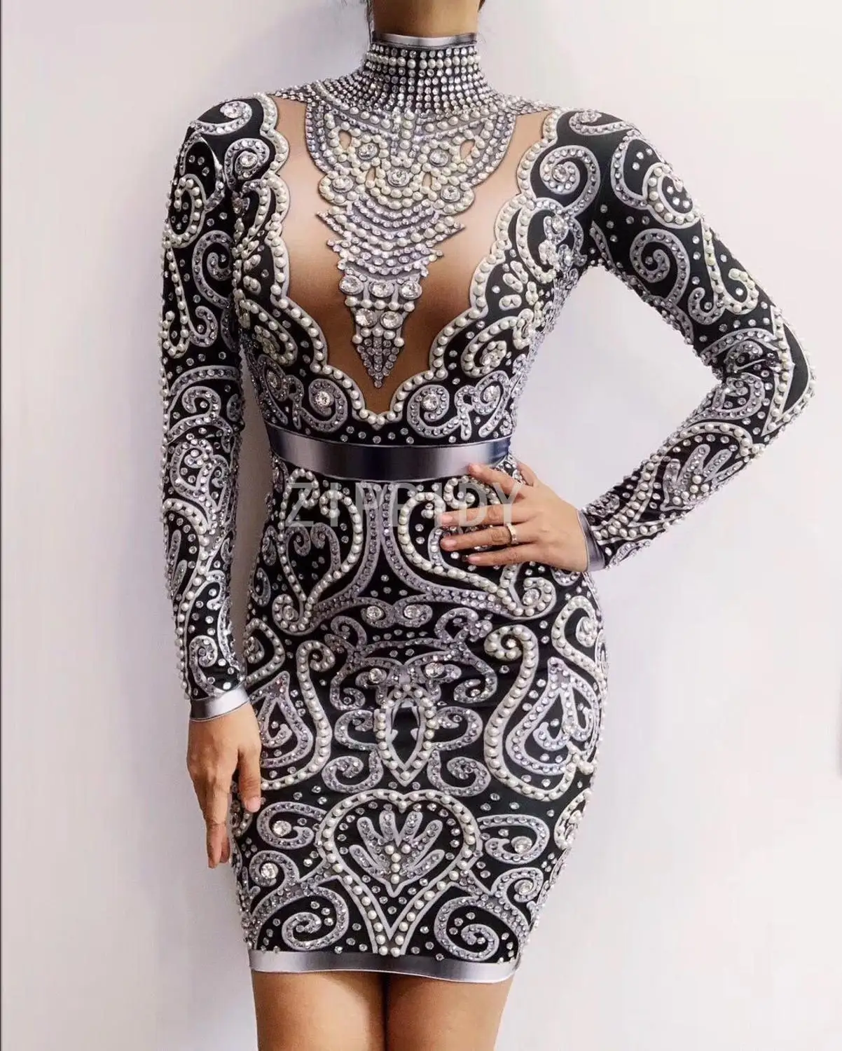 Sexy Jumpsuit Stage Performance Dance Rompers New Arrive Silver Crystals Bodysuit long Sleeves Birthday Celebrate outfit
