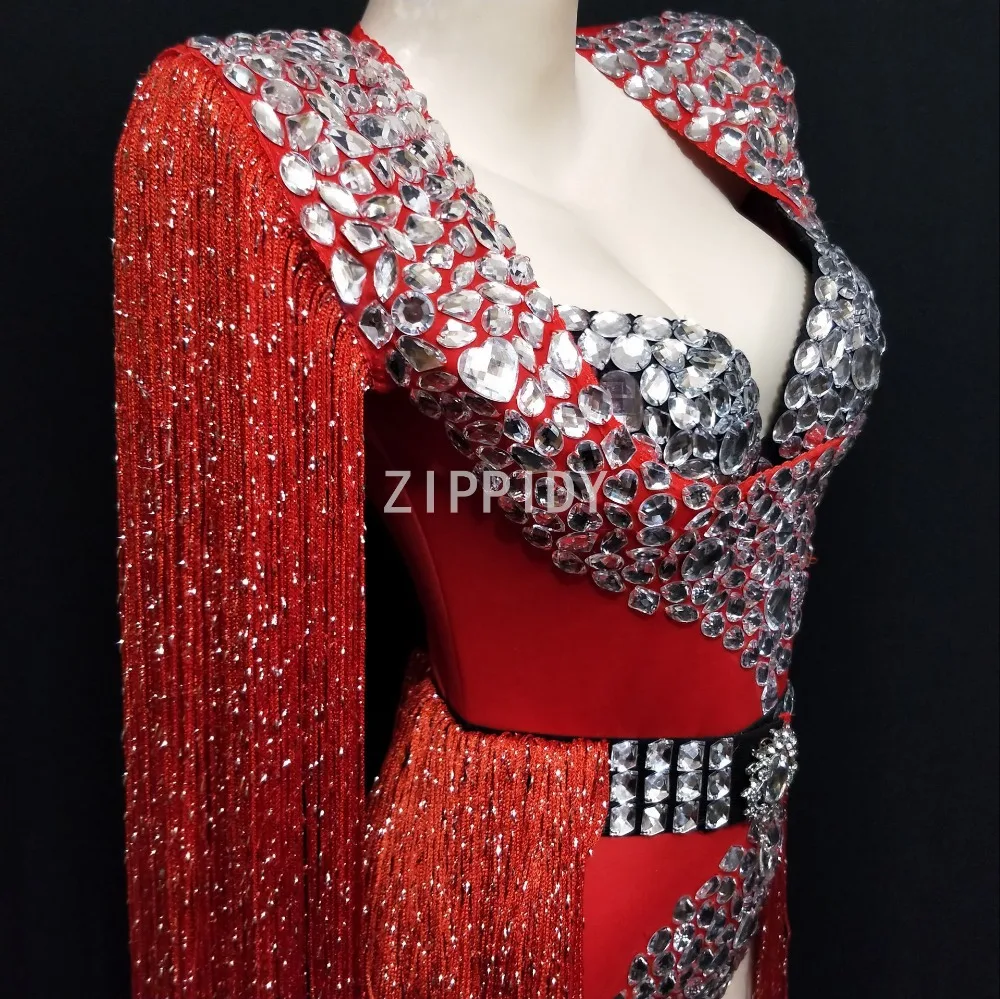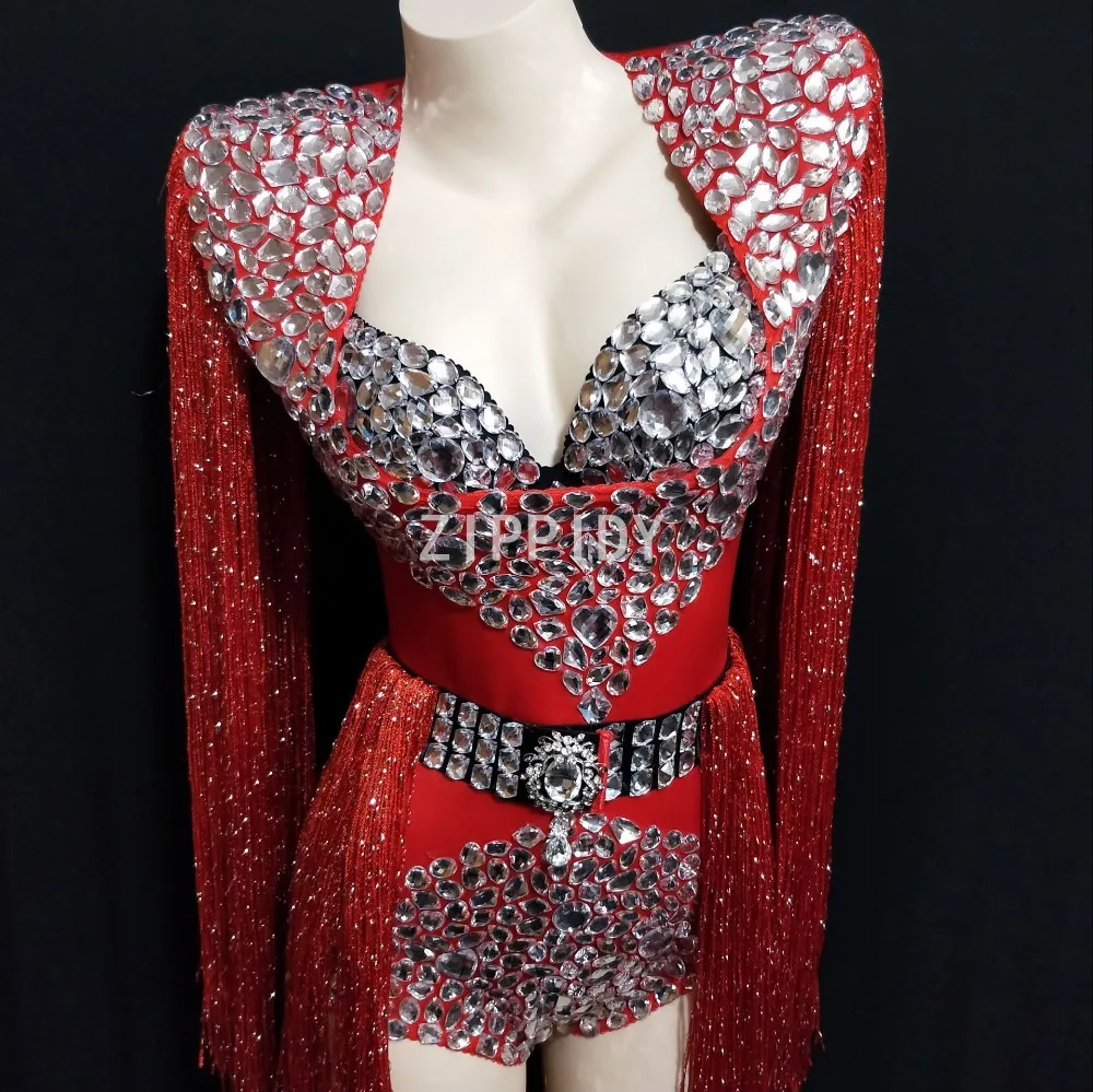 Fashion Blue Red Big Rhinestones Tassel Bodysuit Bra Women's Celebrate Outfit DJ Women Singer Show Nightclub Costume Clothes