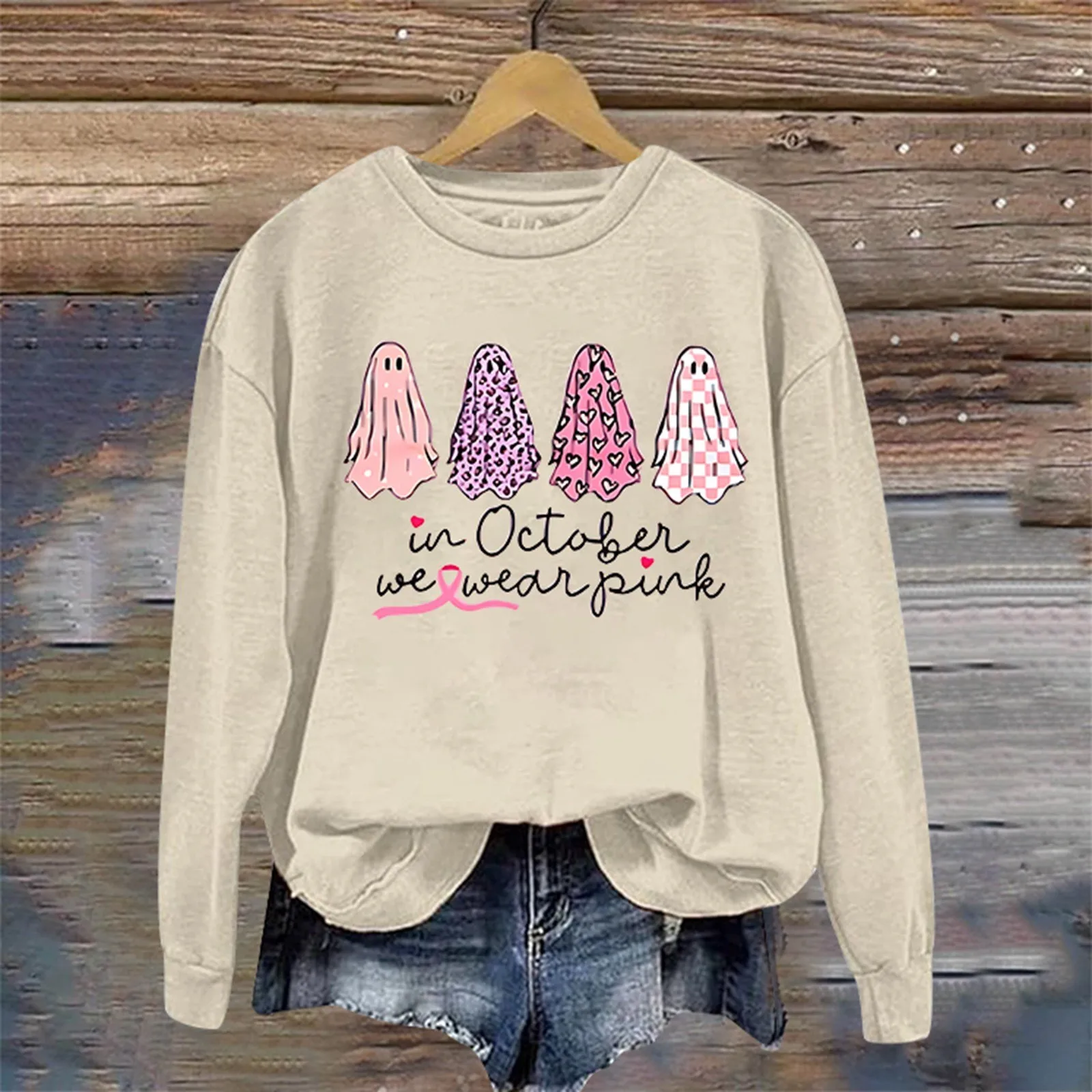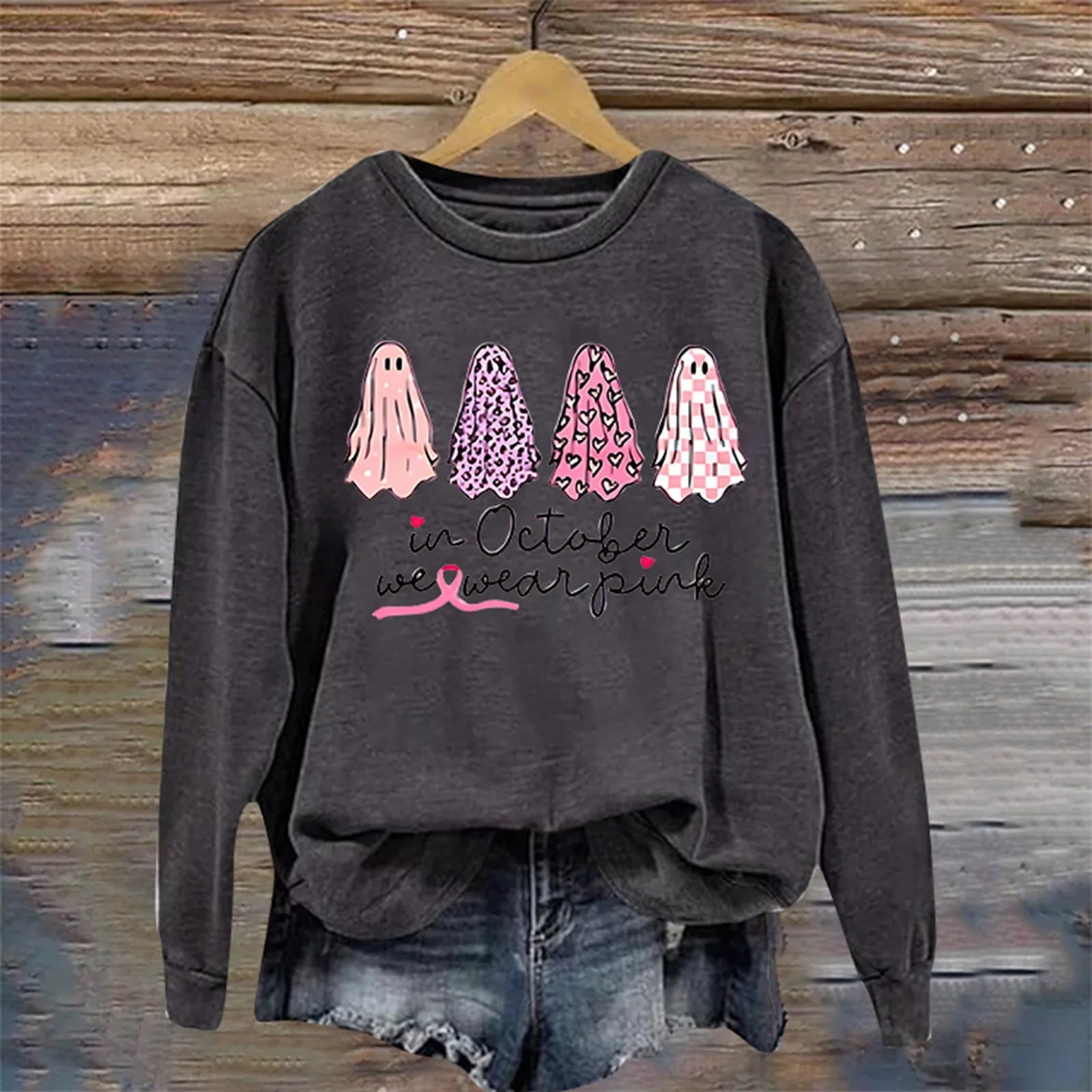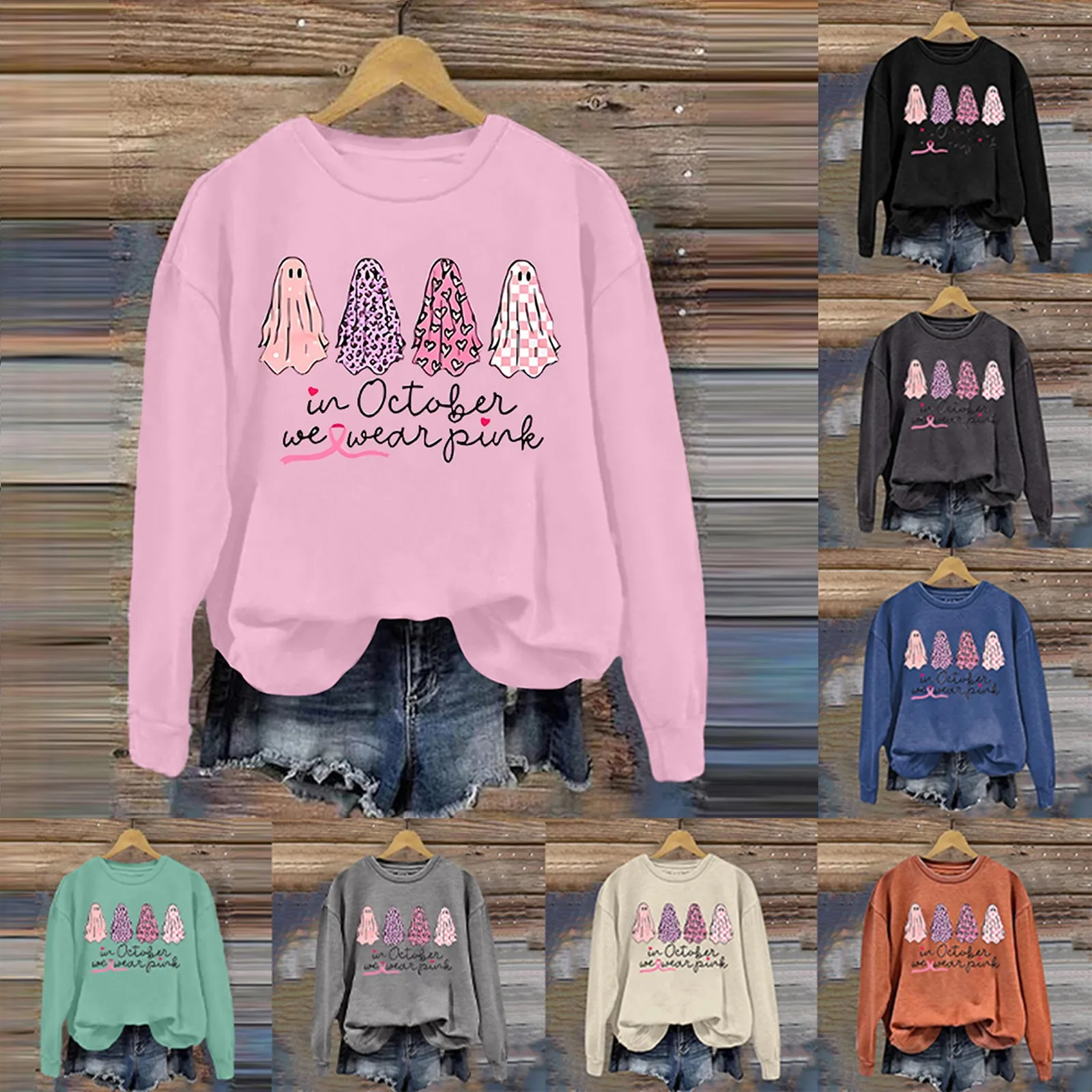 Women Halloween Breast Cancer Ghost Specter Print Crew Neck Long Sleeve Cartoon Graphic Printed Thin Pullover Hoodie Fashion Top