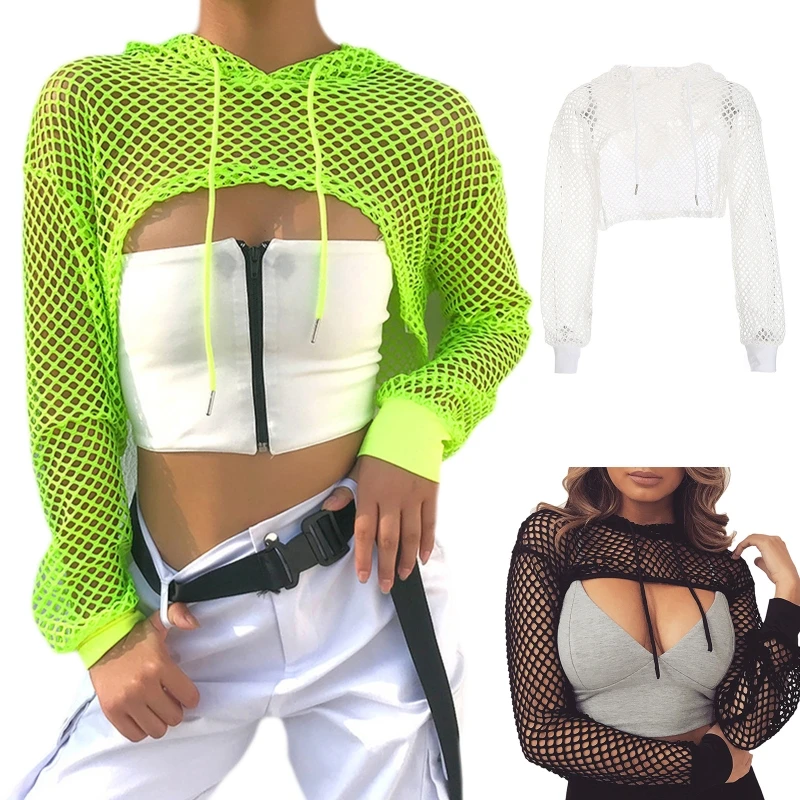 652F Women Long Sleeve Mesh Fishnet Hoodies Crop Top Pullover Cover Up Sweatshirt
