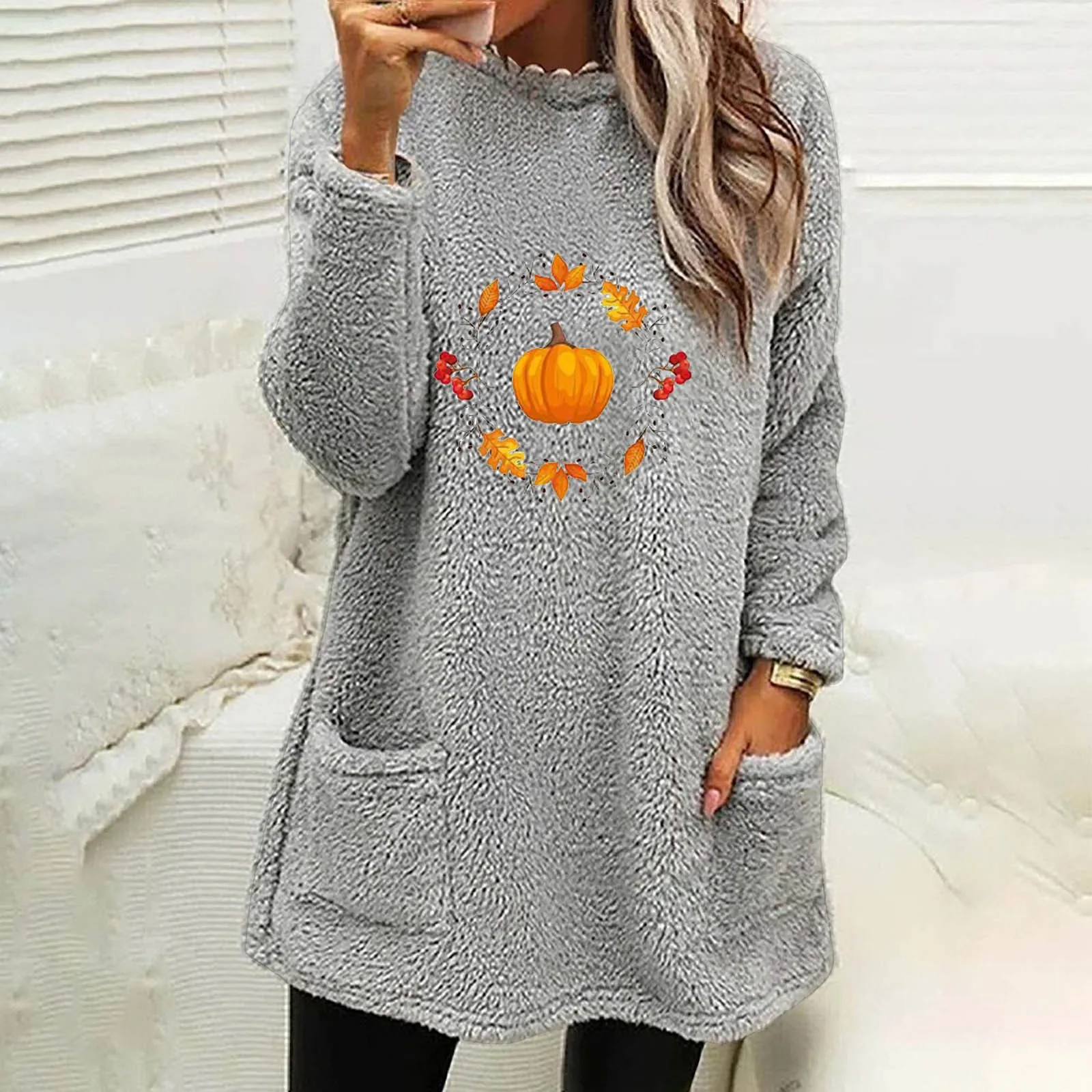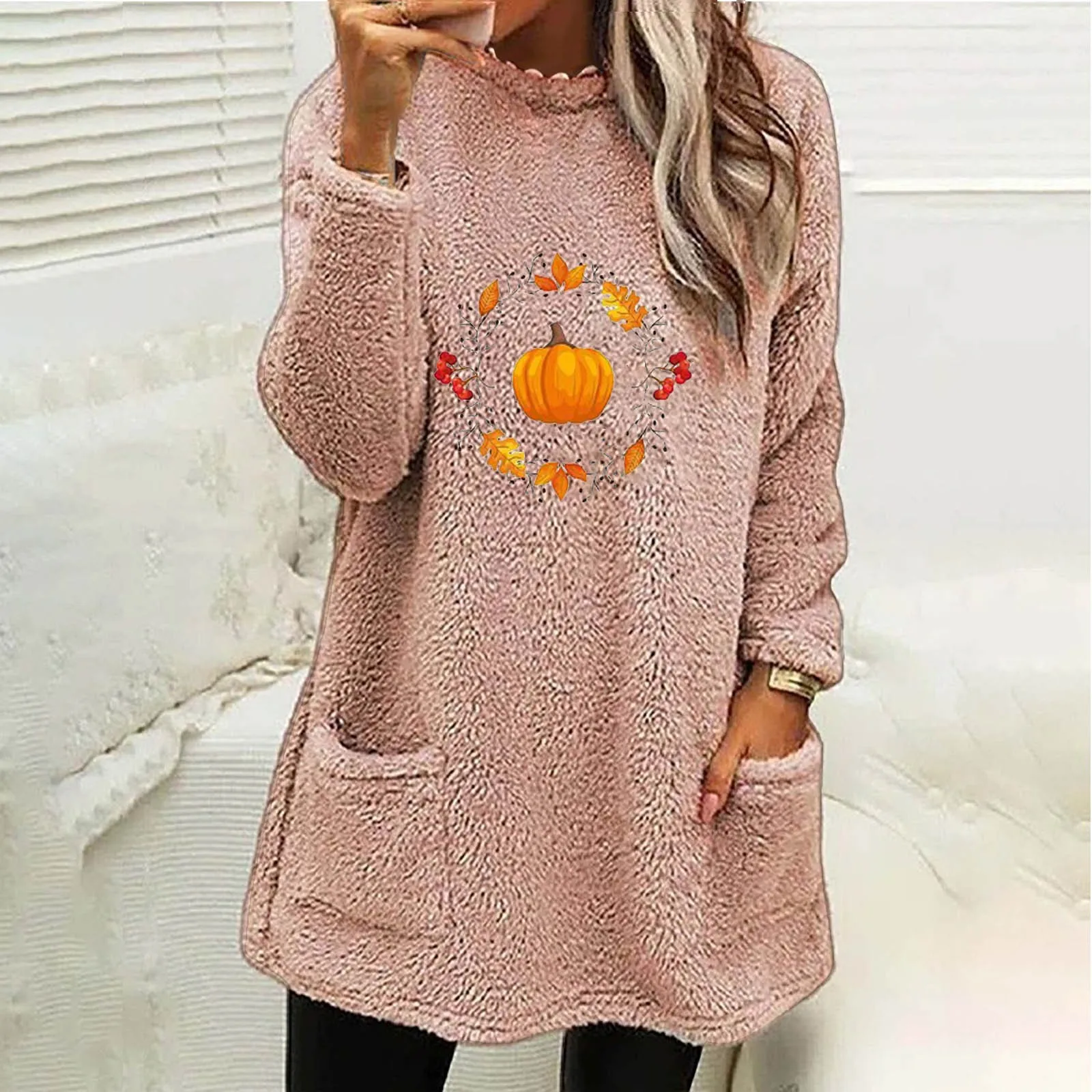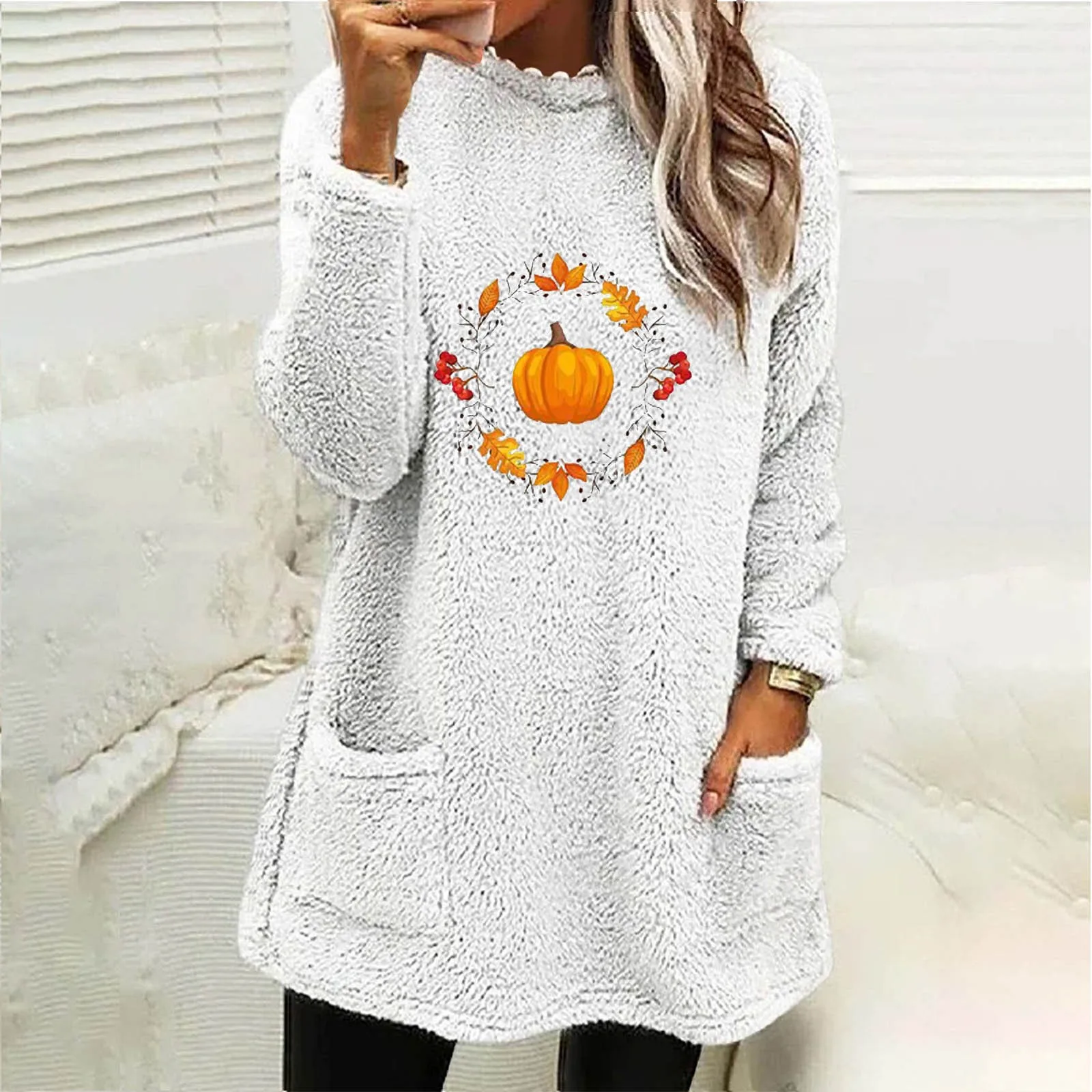 Women Casual Double Fuzzy Halloween Pumpkin Printed Sweatshirt Faux Bunny Zip up Ladies Fashion Sweaters Fall Sweat Shirts