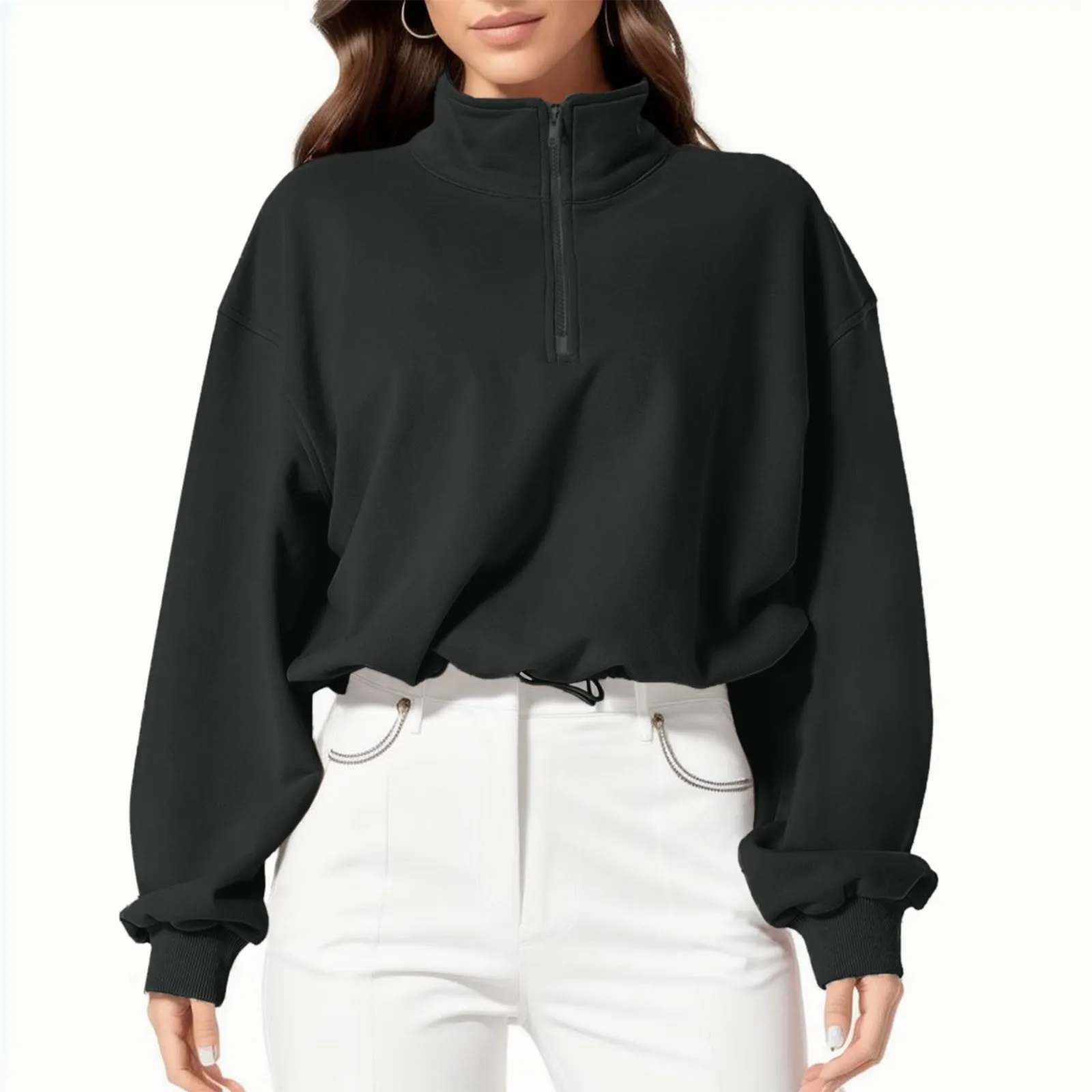 Name | Ladies Half Zipper Crop Sweatshirt Workout Hoodies High Neck Long Sleeve Solid Color Athletic Clothes Loose Casual Ladies Blouse |
