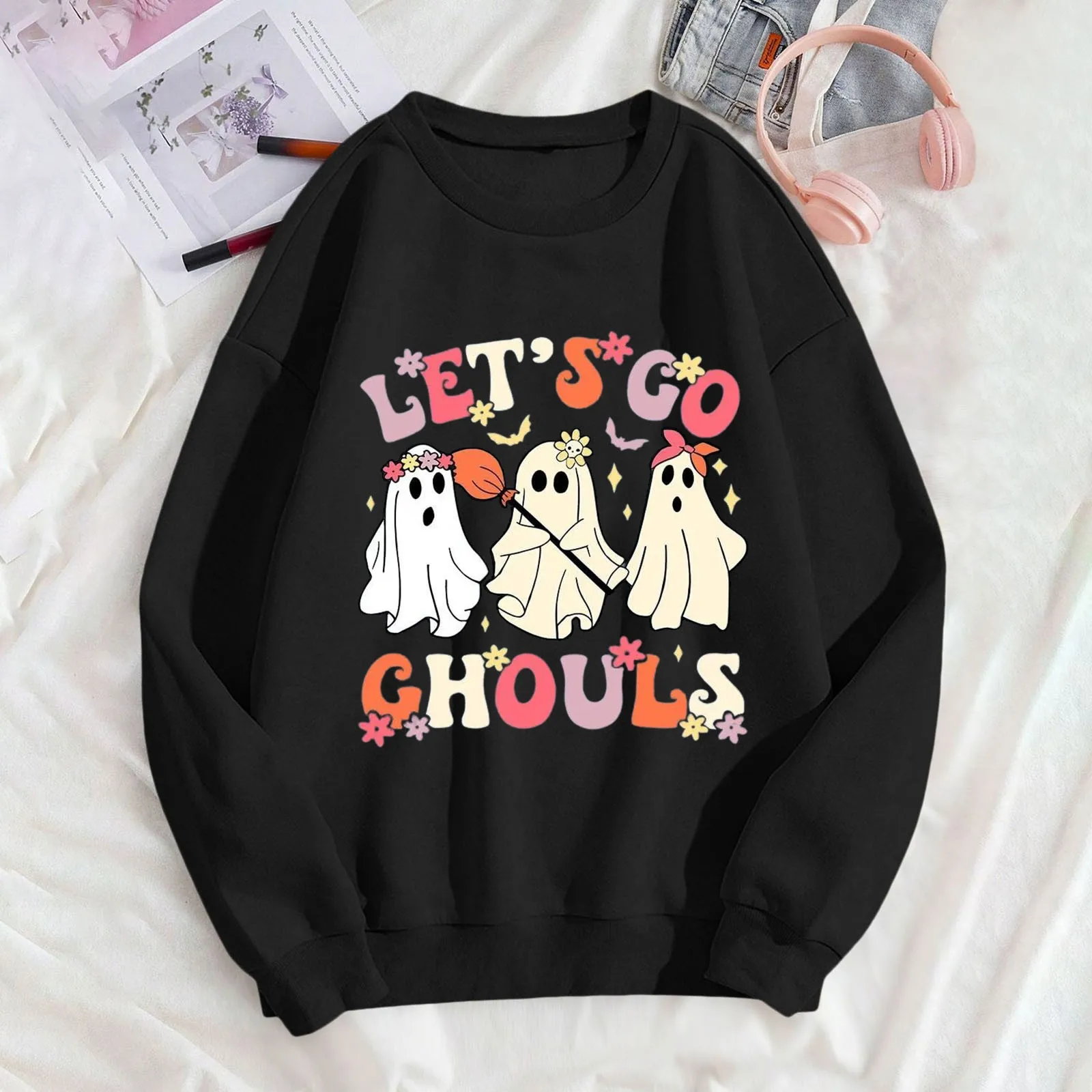 Ladies Halloween Hoodie Cute Little Ghost Print Beautiful Casual Hoodie Autumn And Winter Fashion Round Neck Long Sleeve Jumper