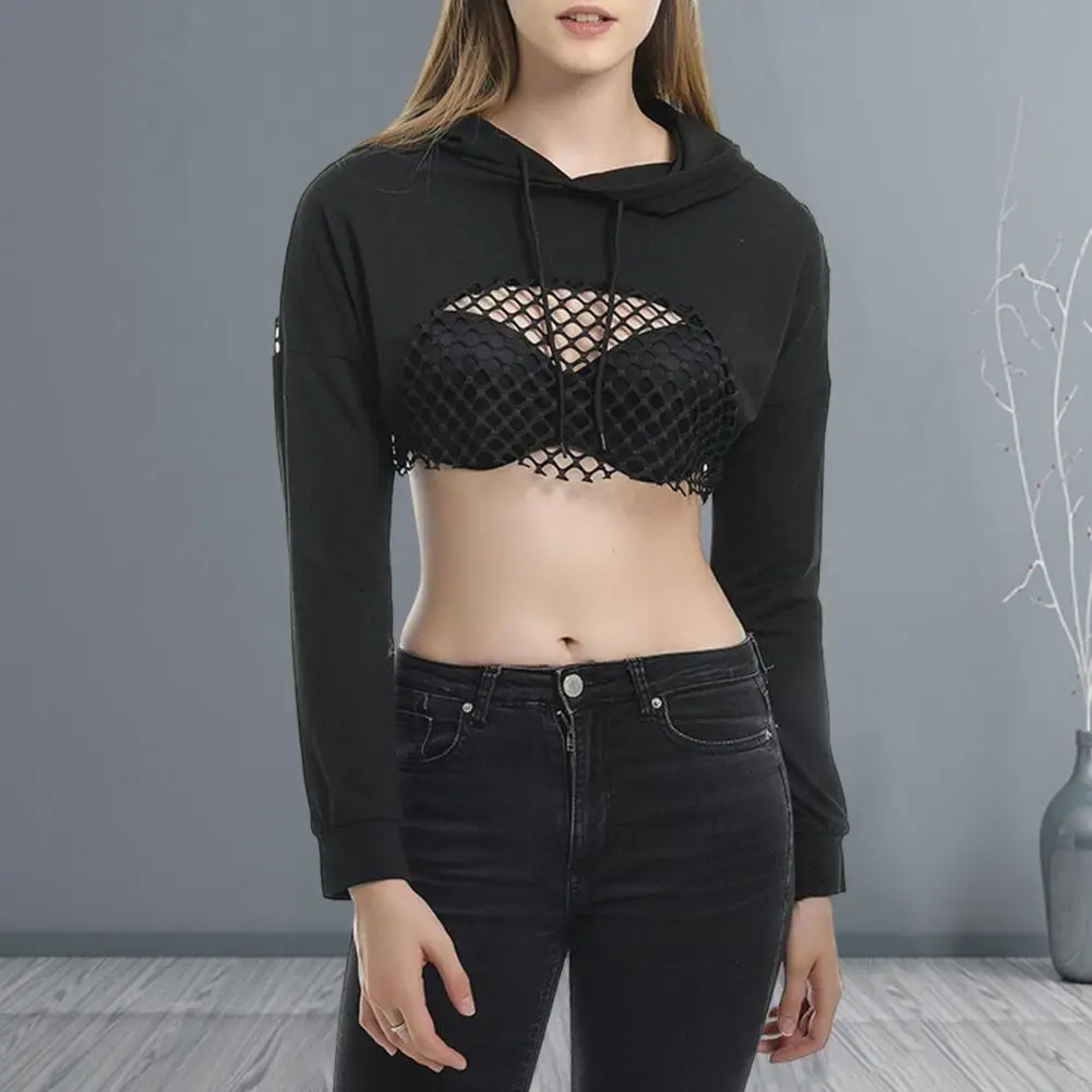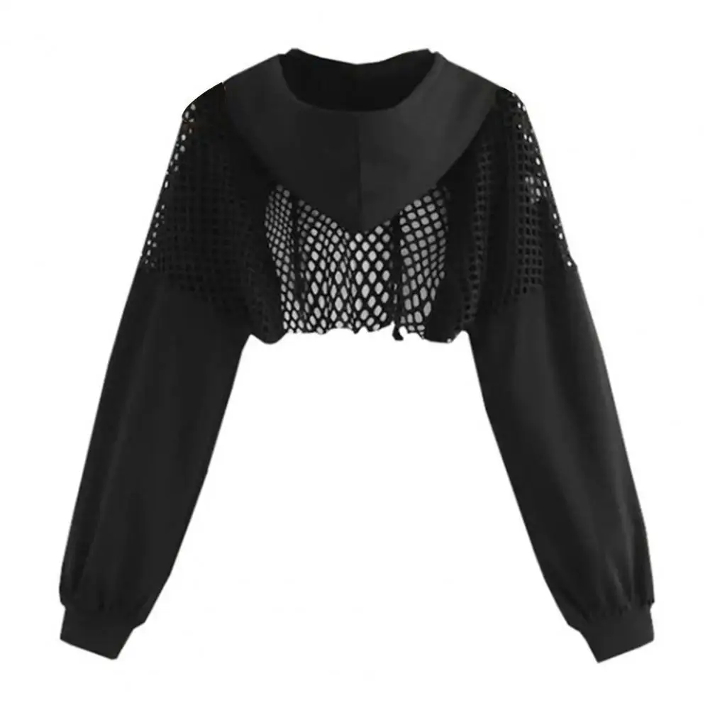 Women Long Sleeve Top Women Pullover Hoodie Stylish Women's Mesh Patchwork Hoodie with Drawstring Waist for Streetwear Club