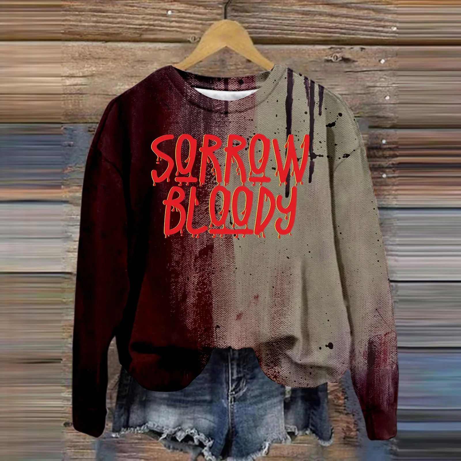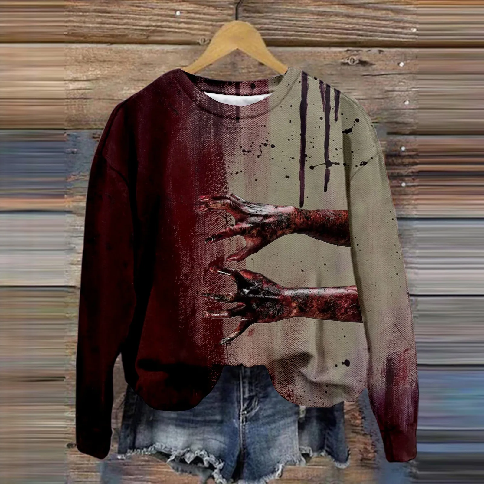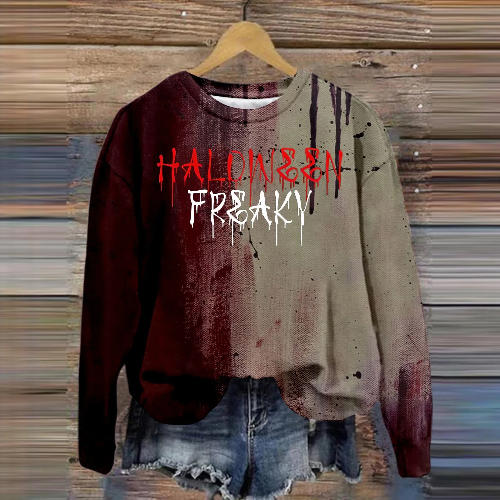 Women's Halloween Bloodstaine Printed Crew Neck Long Sleeve Thin Pullover Top Ladies Fleece Tops Long Sleeve