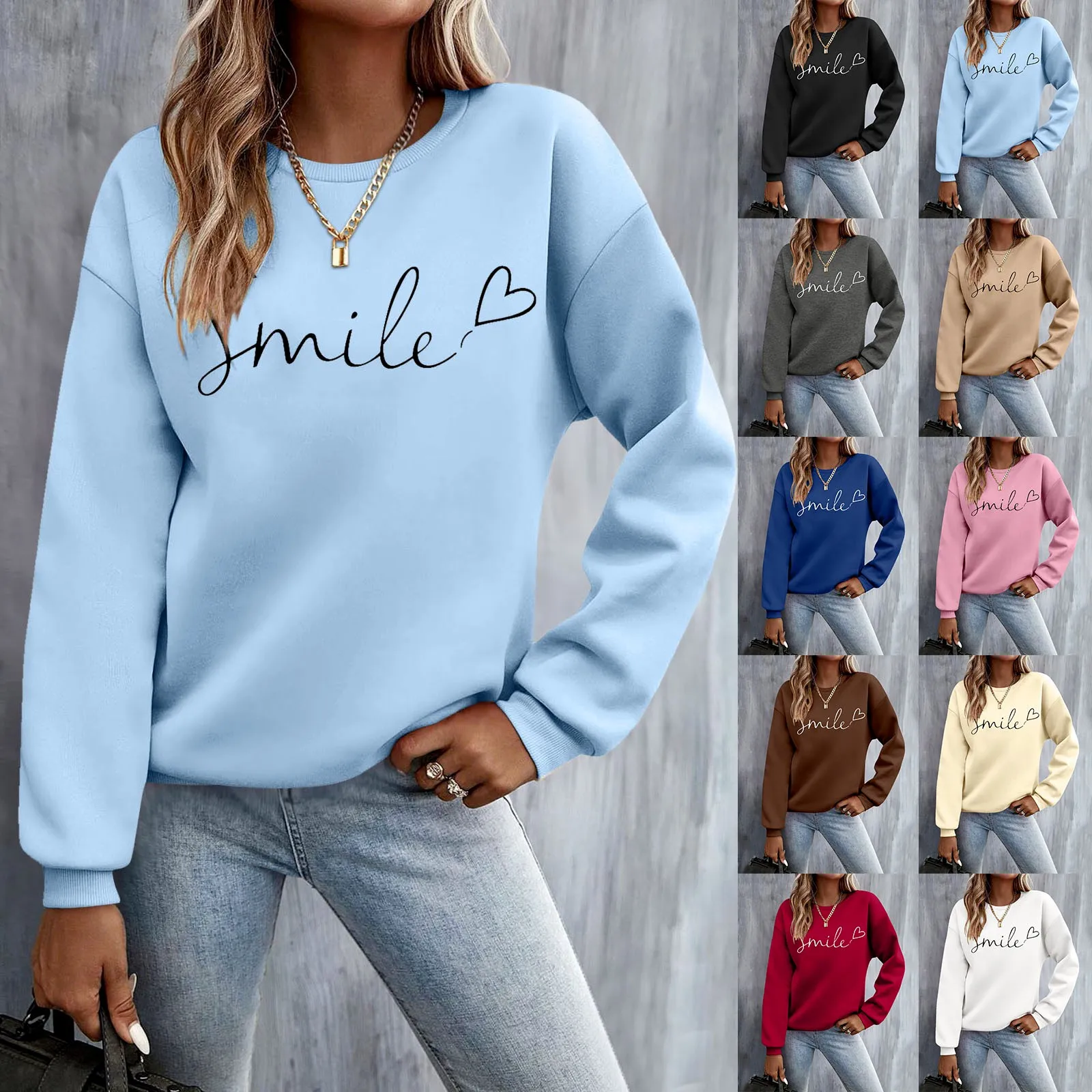 Smile Love Printed Ladies Aesthetic Simple Hoodie Round Neck Long Sleeve Comfortable Pullover Temperament Casual All Match Tops