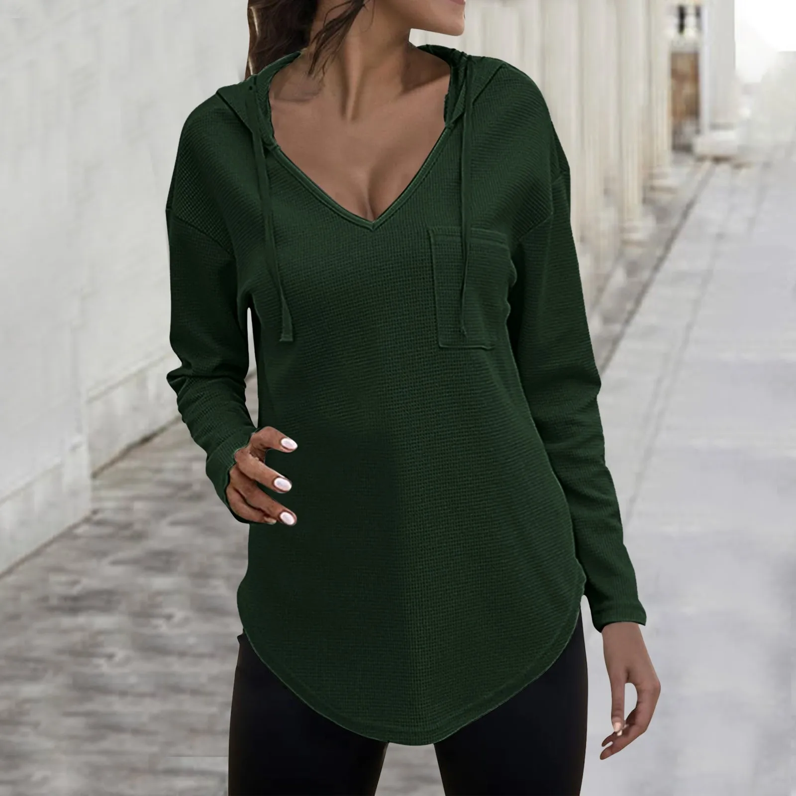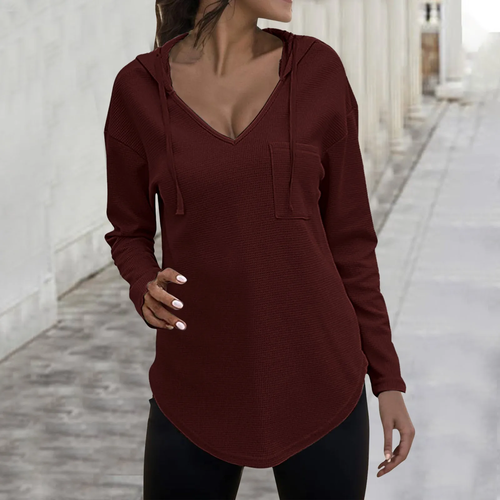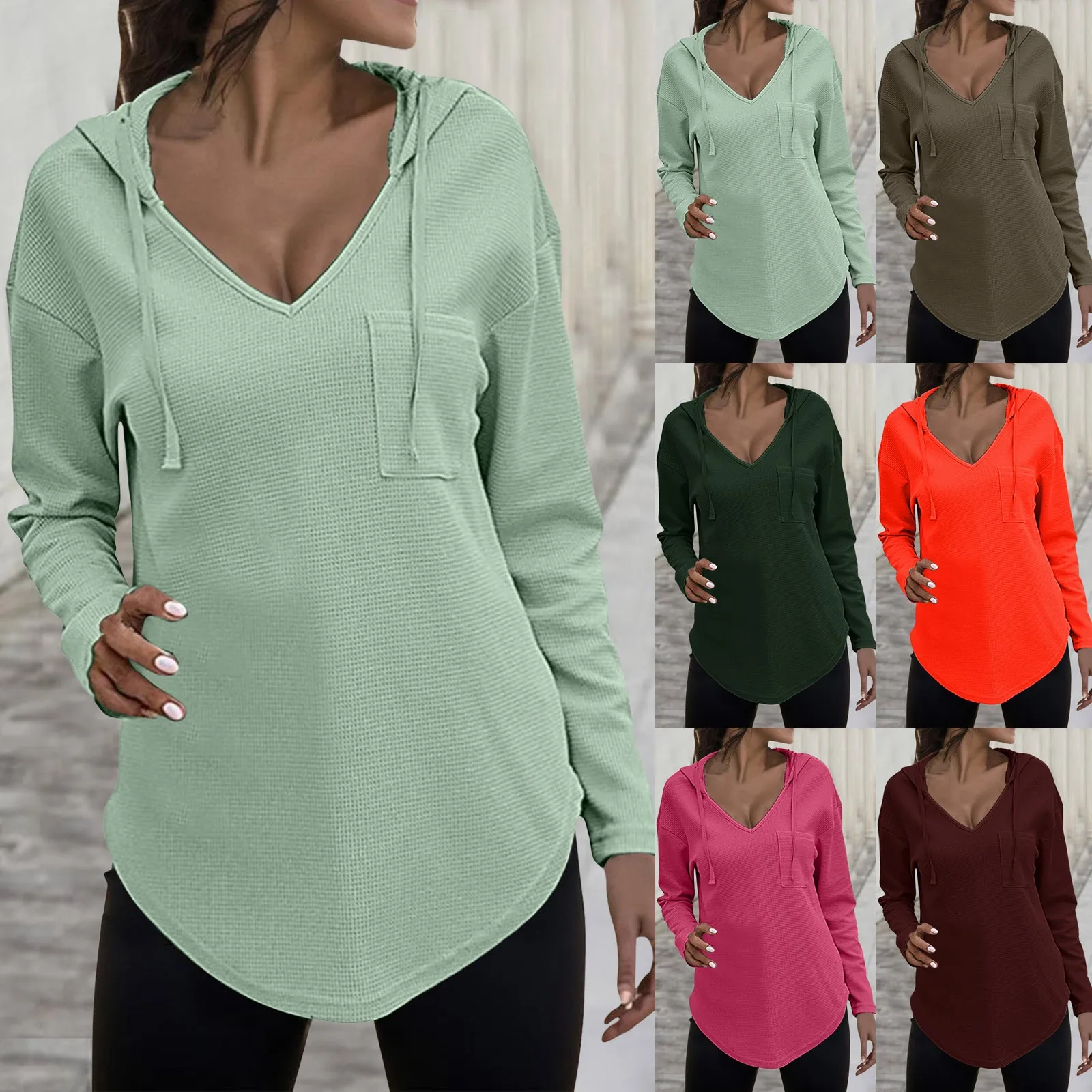Women's V Neck Hoodies Long Sleeve Sweatshirt Drawstring Pullover Tops With Pocket Plus Size Knitted Sweater Solid Blouse