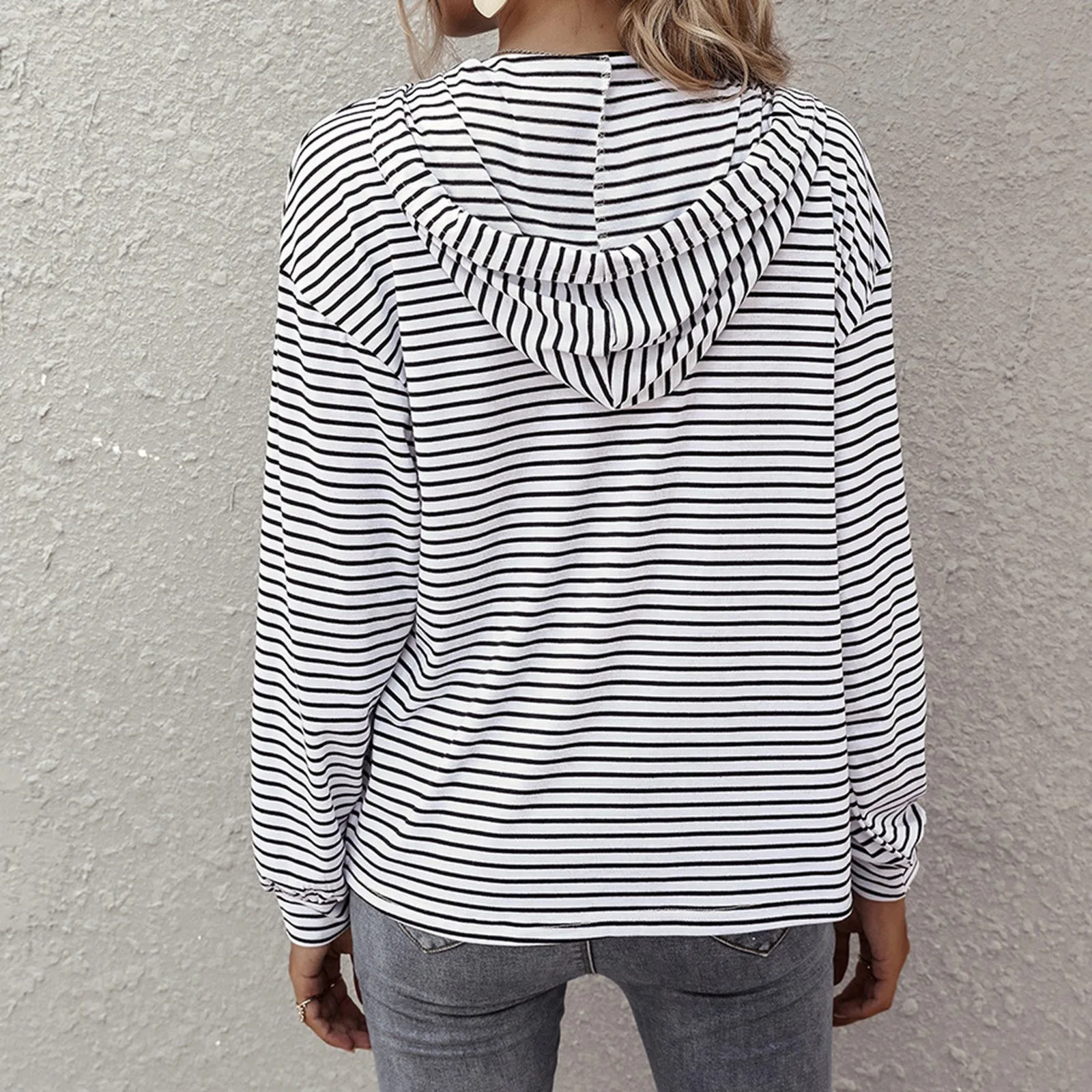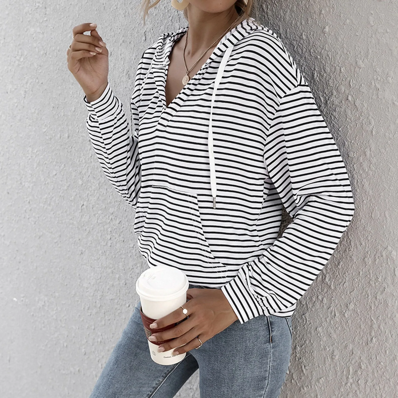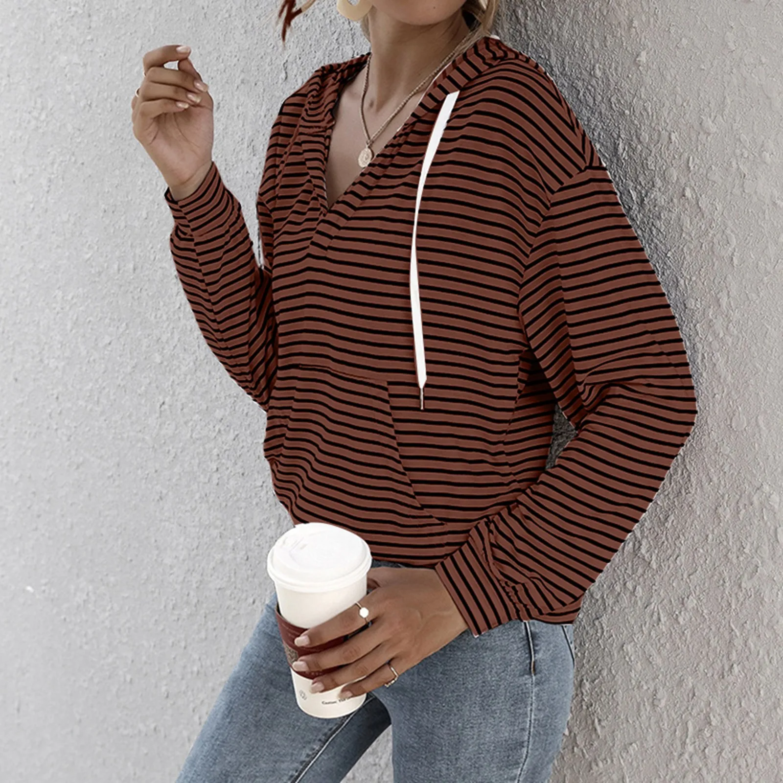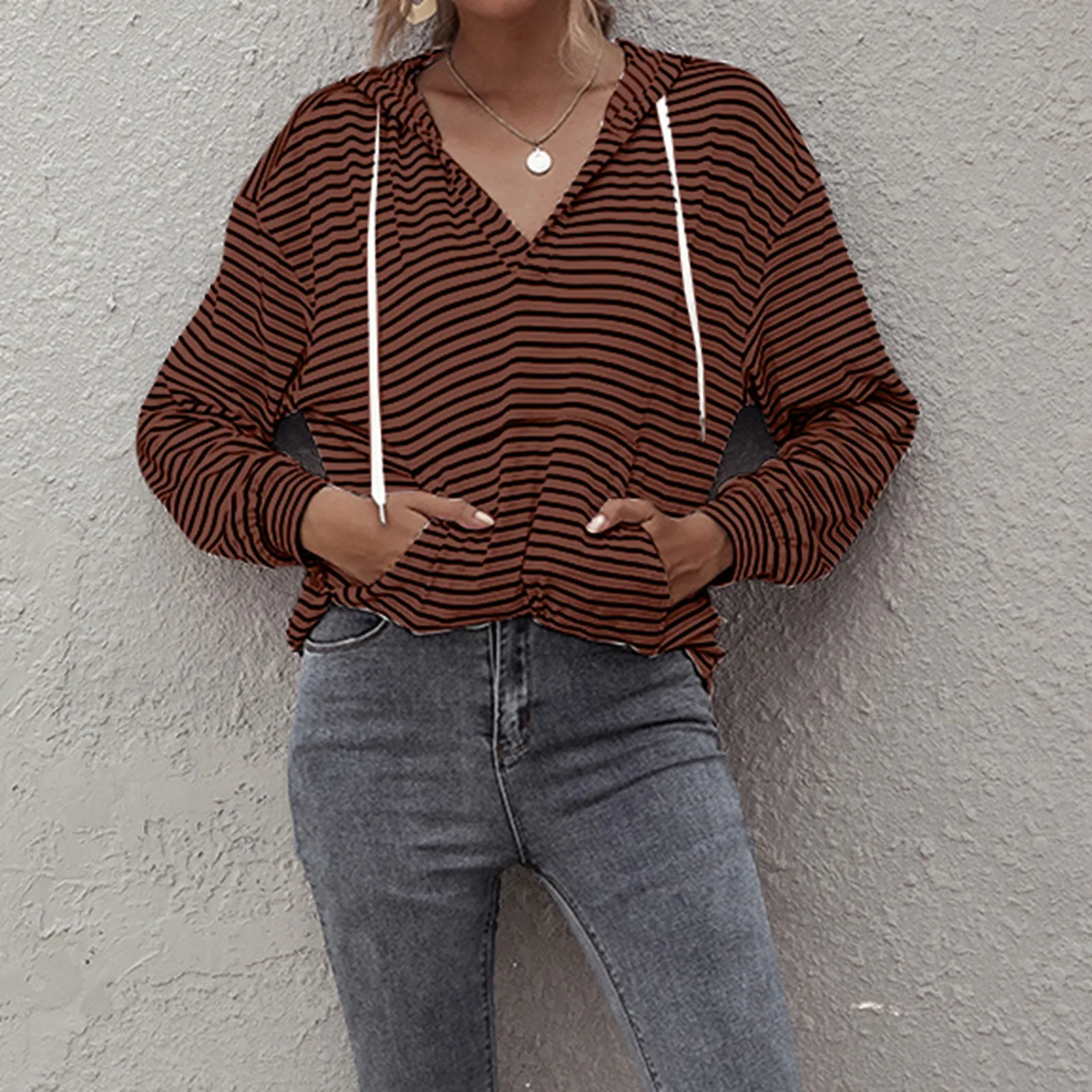 2024 Fashion New Casual Striped Printed Tops Spring And Autumn Low V Neck Hoodie Wome's Loose T-Shirt Harajuku Hoodie Sweatshirt