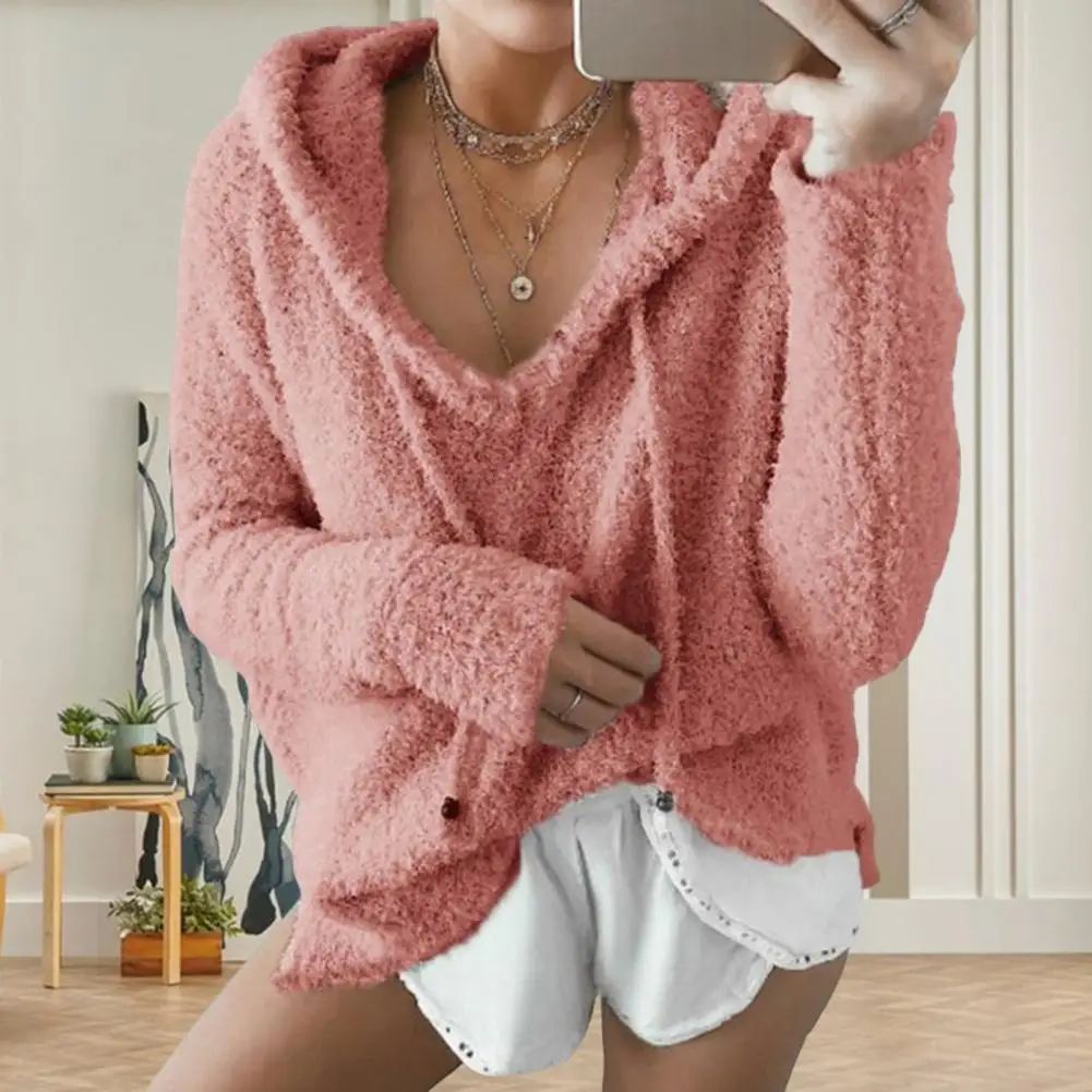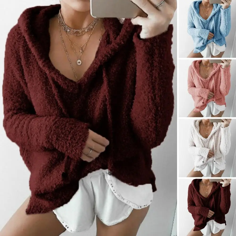 Auutmn Winter Women Hoodie Drawstring Thick Fuzzy Long Sleeves Solid Color Loose Heat Retention Pullover Casual Wear Sport Top