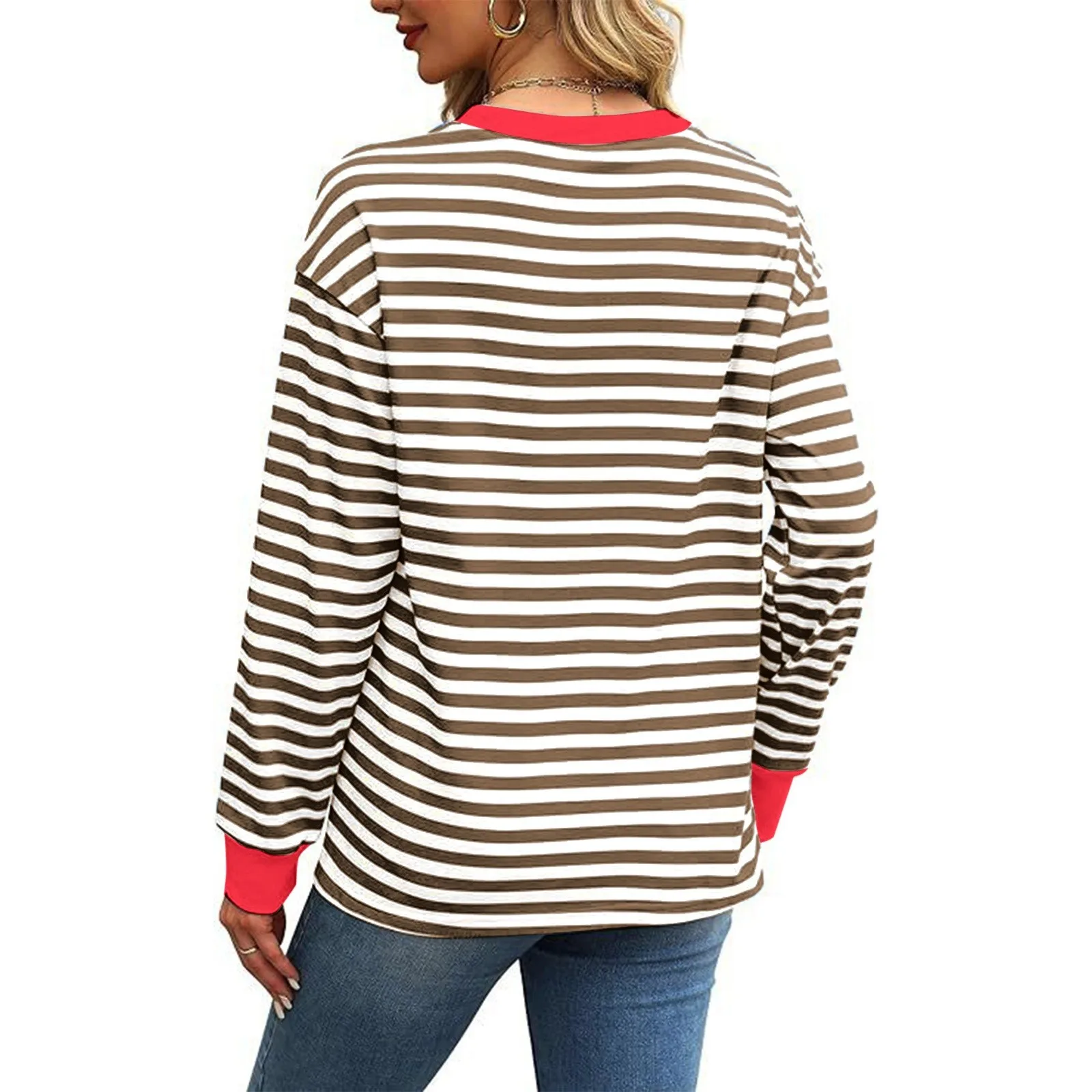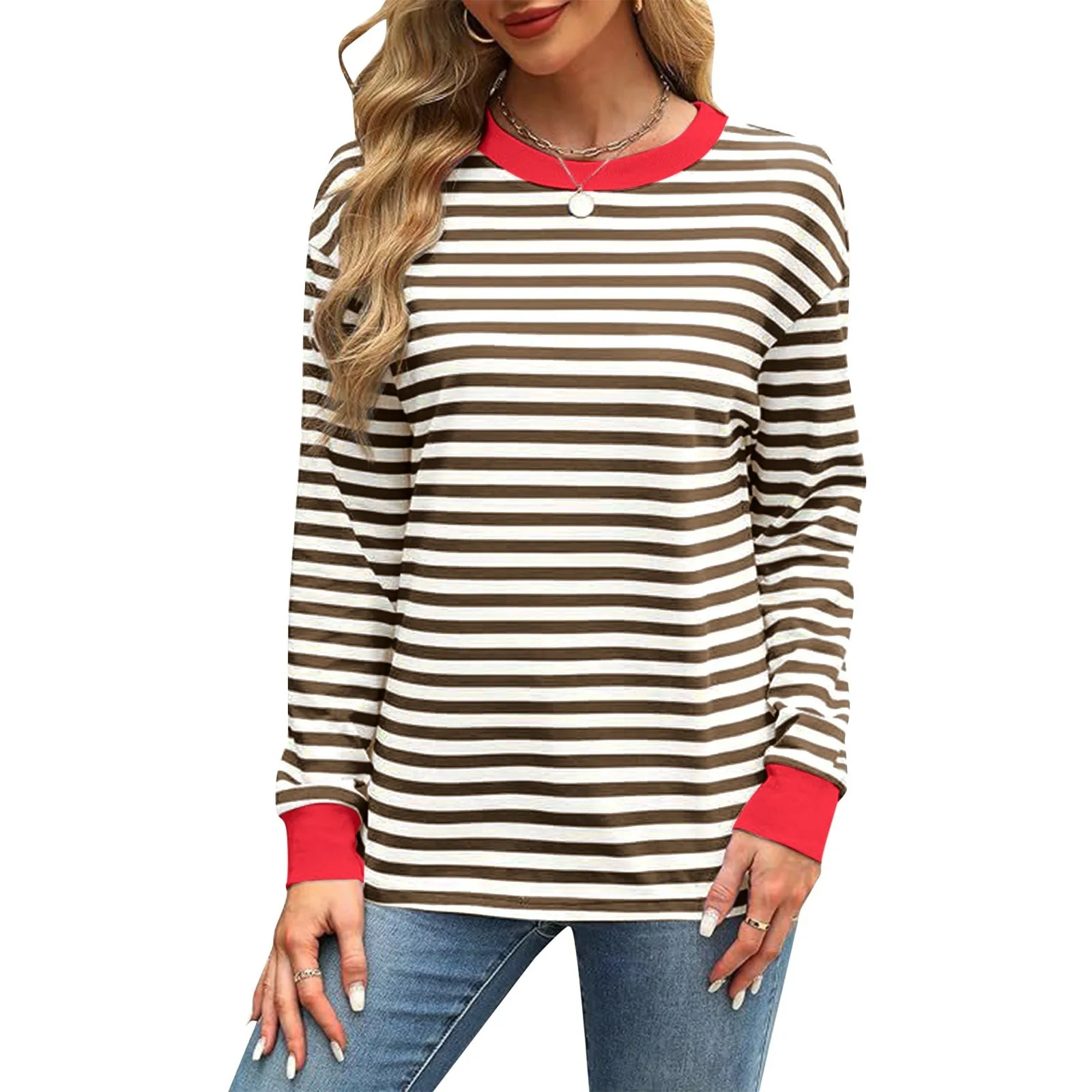 Fashionable Contrast Color Loose Crew Neck Striped Long Sleeve Top Women's Casual Wear Christmas Sweatshirts Women