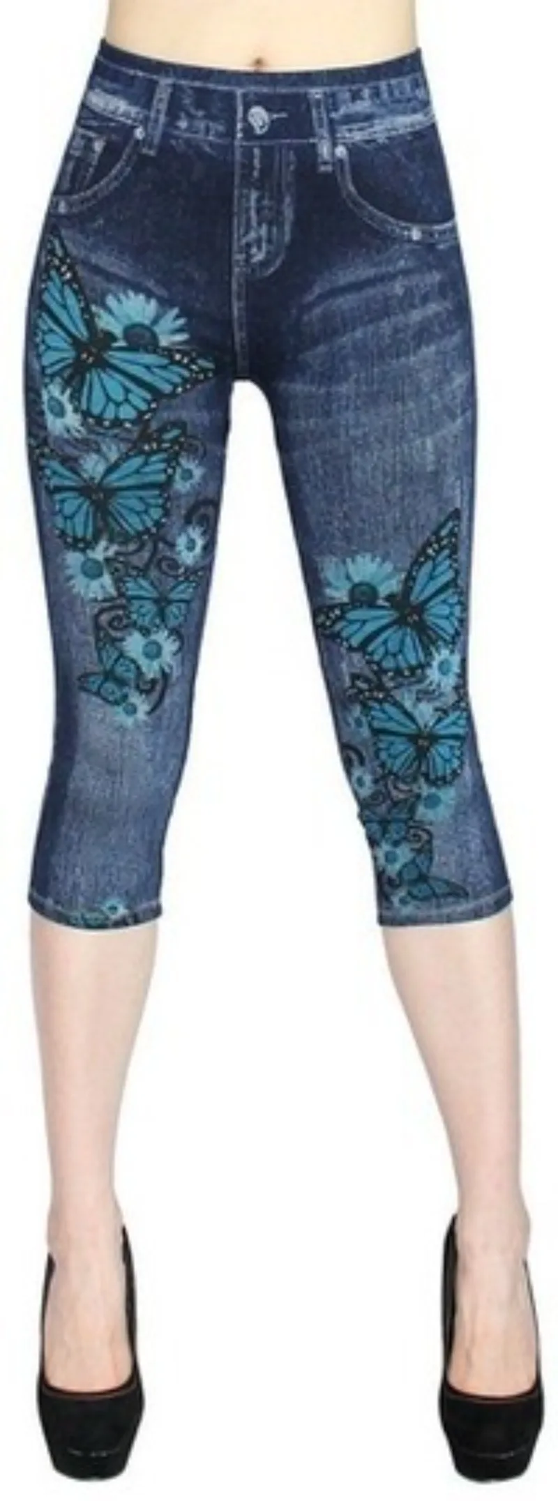 Women Fake Imitation Denim Leggings Cropped Pants Printed High Waist Sexy Slim Ankle Length Pants