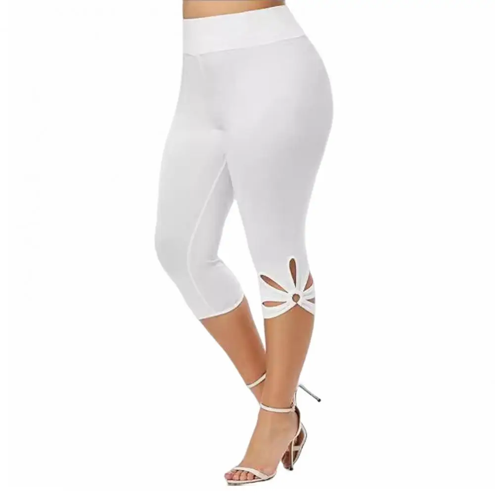 Summer Women Leggings Thin Mid-rise Elasticity Cropped Pants Solid Color High Waist Pants Petal Cuffs Slim Sport Leggings