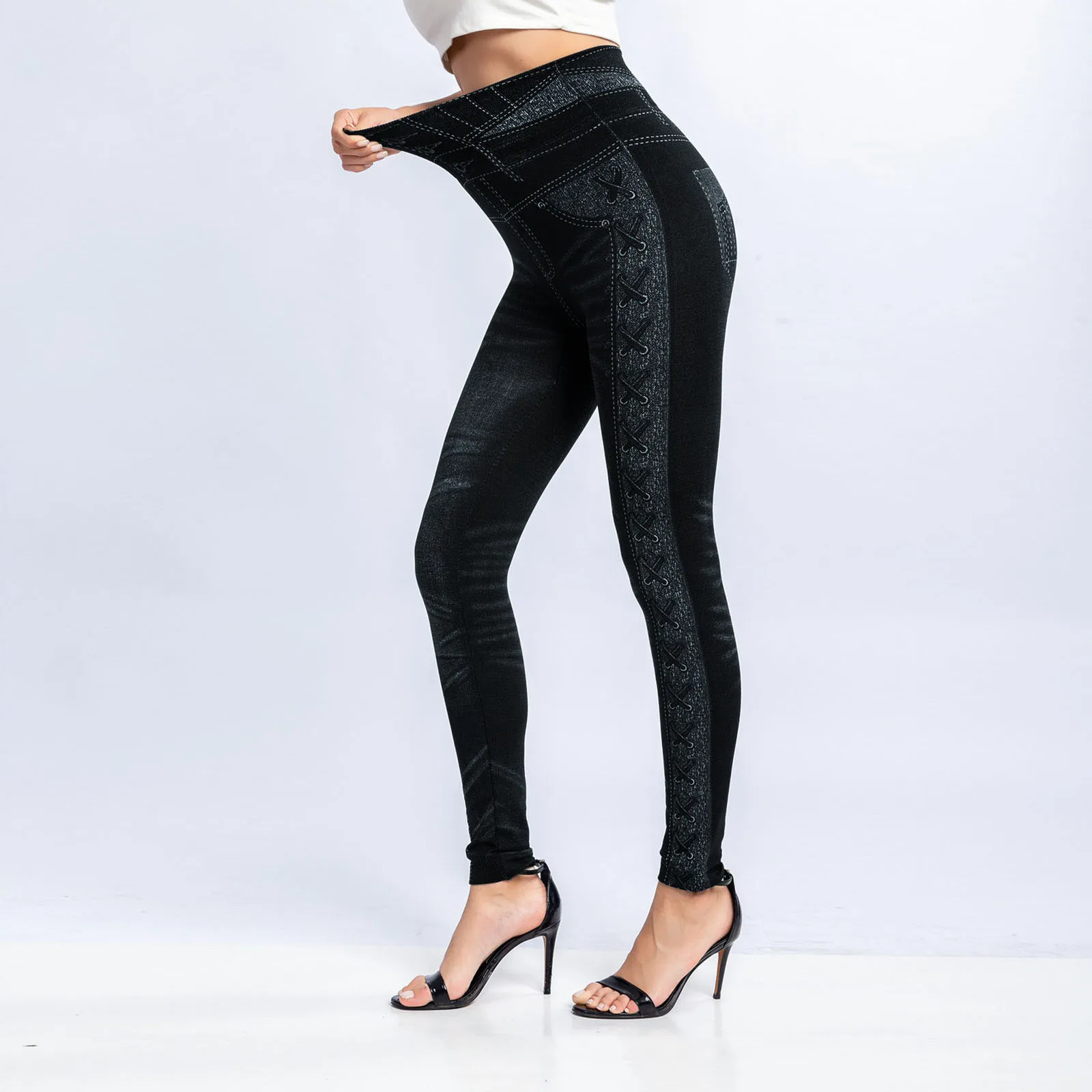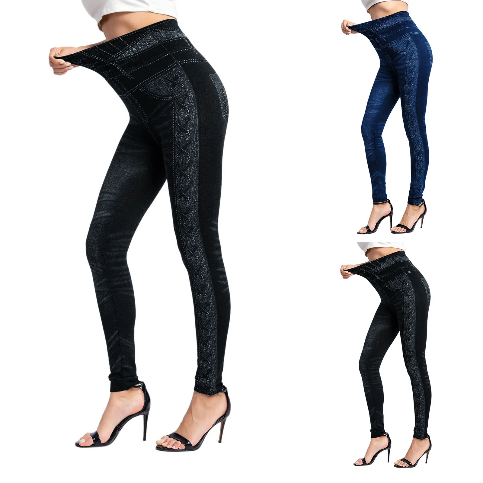 Women'S Imitation Denim Leggings High-Waisted Side Printed Hip Lift Niners Casual Skinny Yoga Pants Slim Shape Leggings