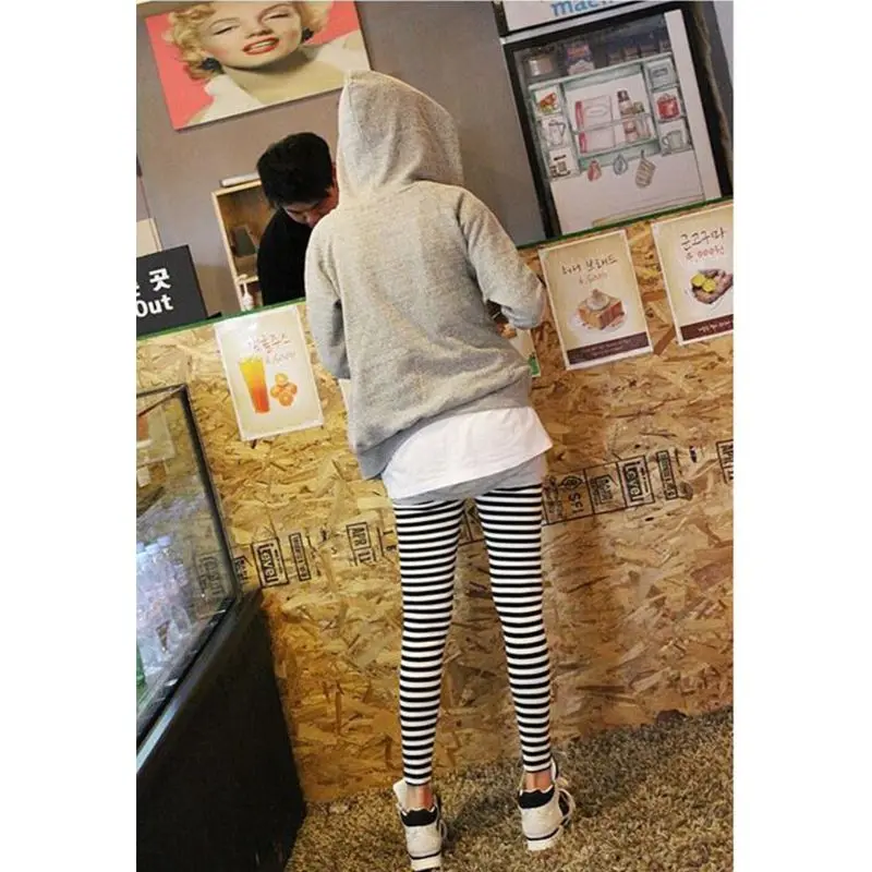 Womens Autumn Ankle Length Skinny Leggings Black White Horizontal Striped Printing Pencil Pants Stretch Casual Tights Dropship