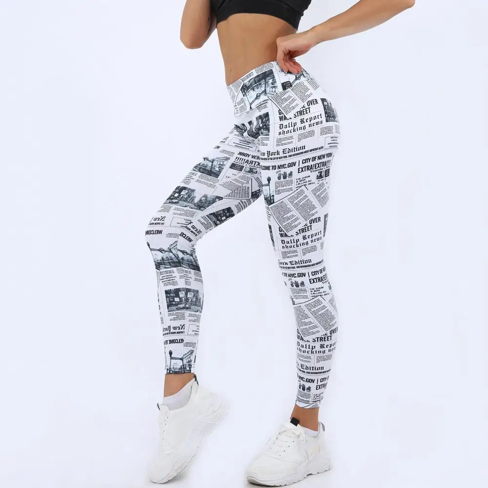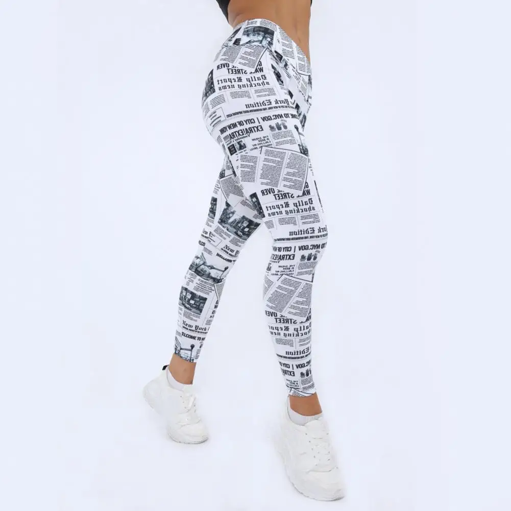 Stylish Newspaper Letter Print Skinny Pants Quick Drying Fitness Pants Tummy Control Yoga Pants for Sports