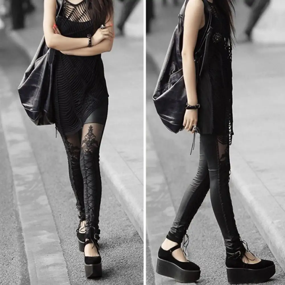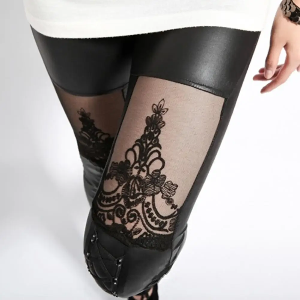 Mid-Rise Elastic Waistband Embroidery Lace Stitching Cross Bandage Faux Leather Pants Sexy High Elasticity Skinny Long Leggings