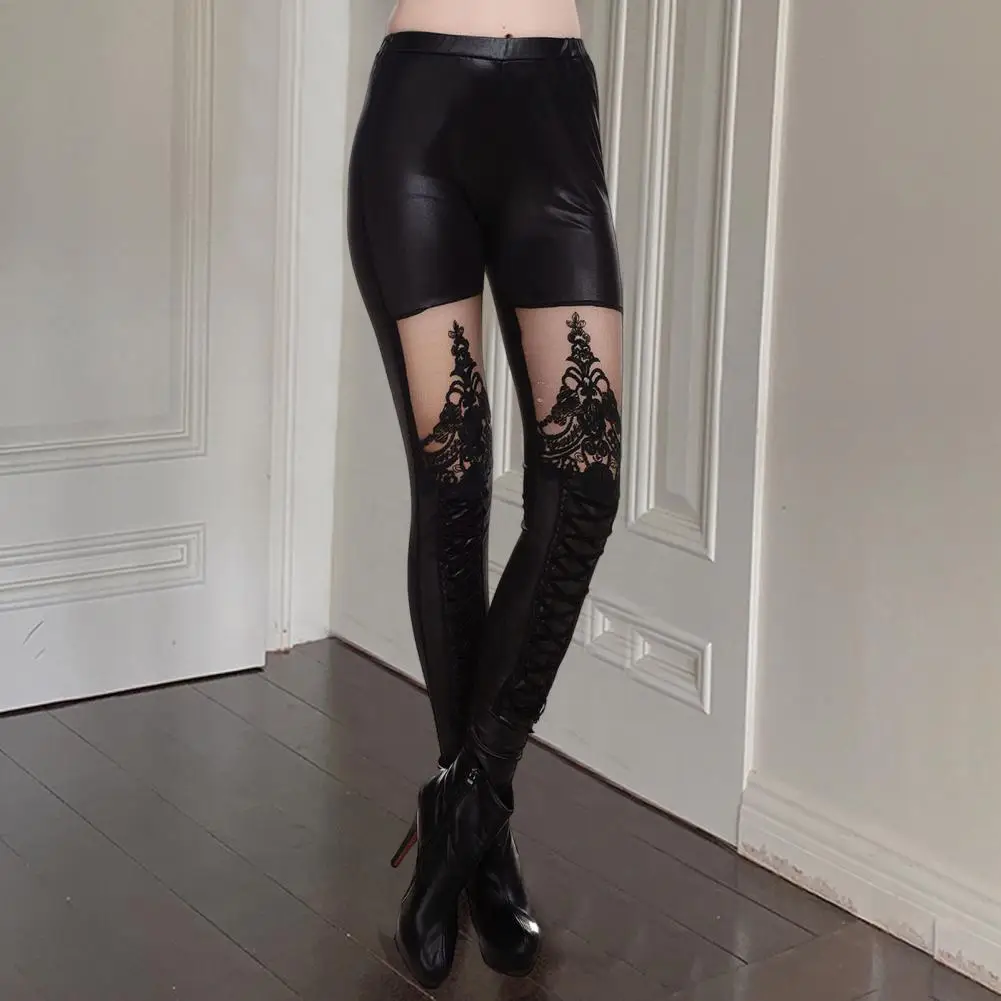 Women Leggings See-through Windproof Sexy High Elasticity Skinny Long Leggings Lace-up Calf Faux Leather Pants Club Wear