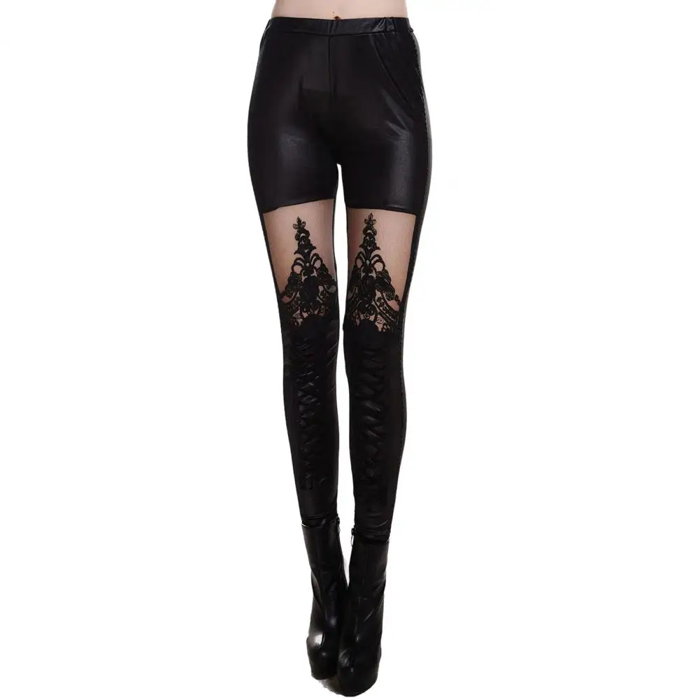 Women Leggings Mid-Rise Elastic Waistband See-through Lady Skinny Trousers Lace Stitching Sexy High Elasticity Long Leggings