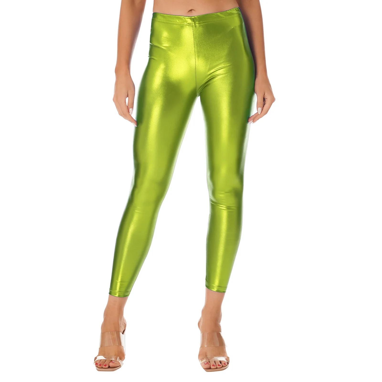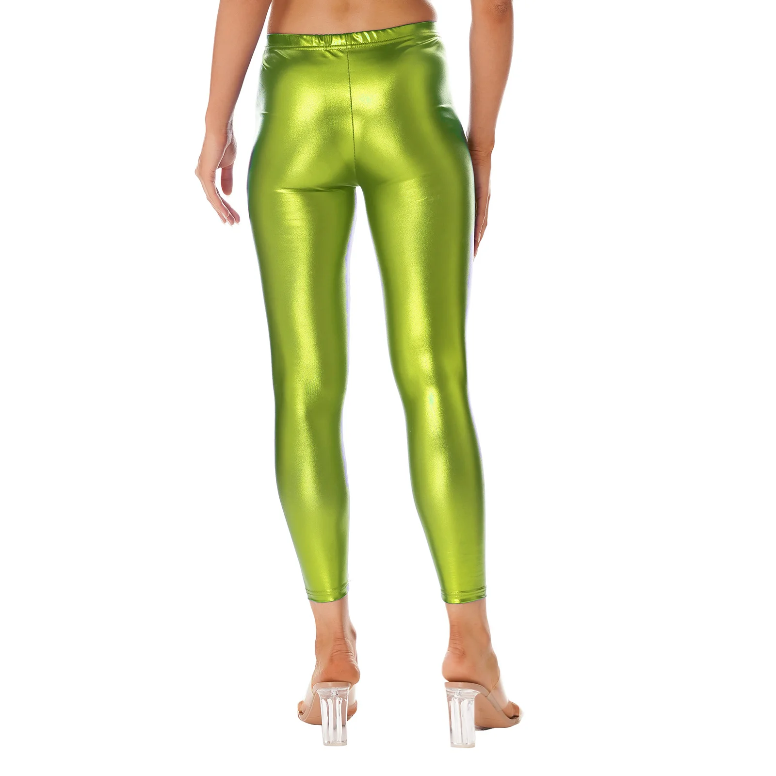 Womens Shiny Mid Waist Elastic Waistband Skinny Pants Female Clothing Metallic Faux Leather Leggings Nightclub Rave Outfit