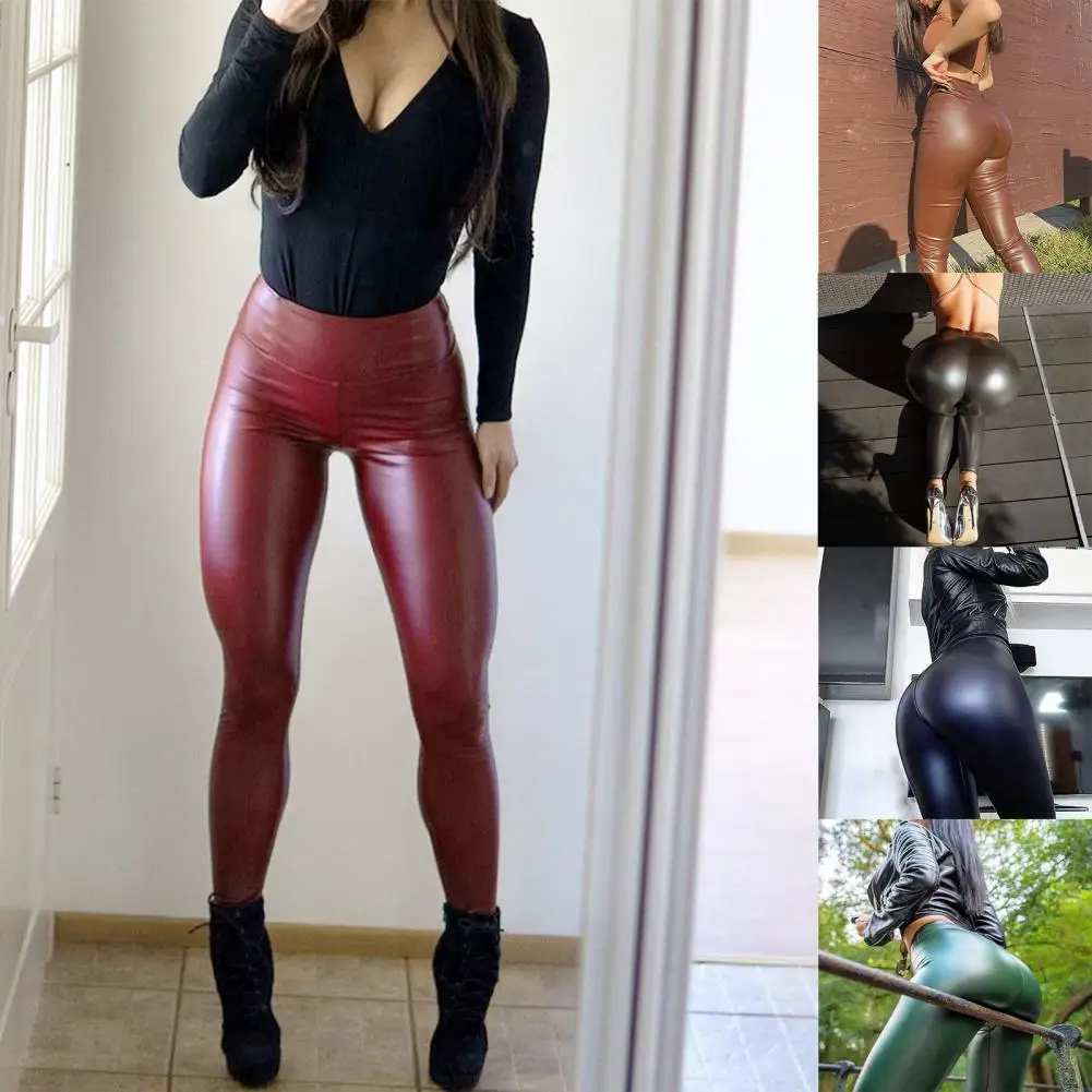 Women Leggings Skinny Faux Leather Pants Elastic Waist Windproof Women Trousers