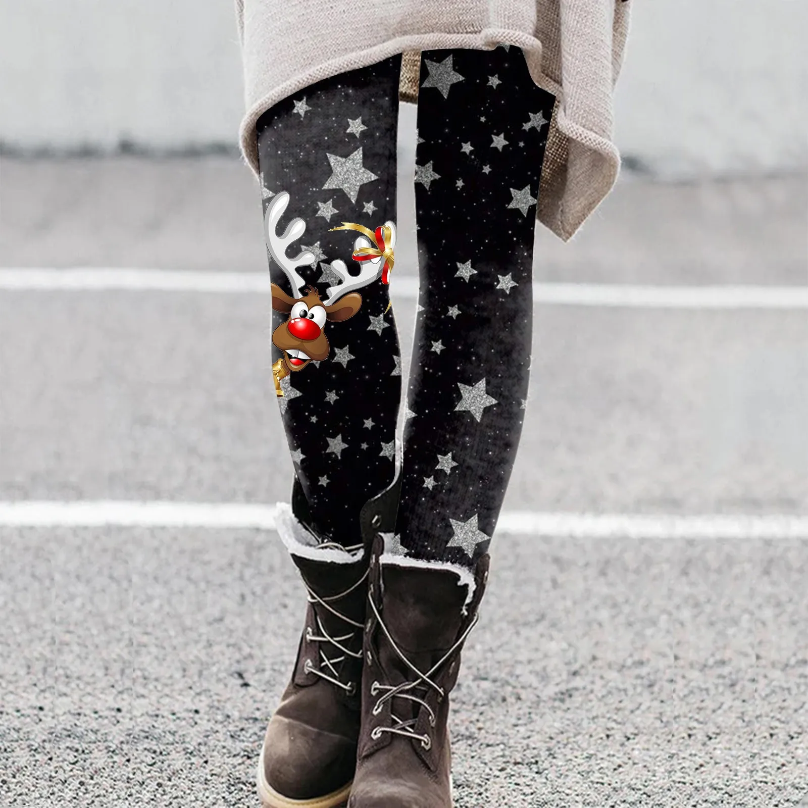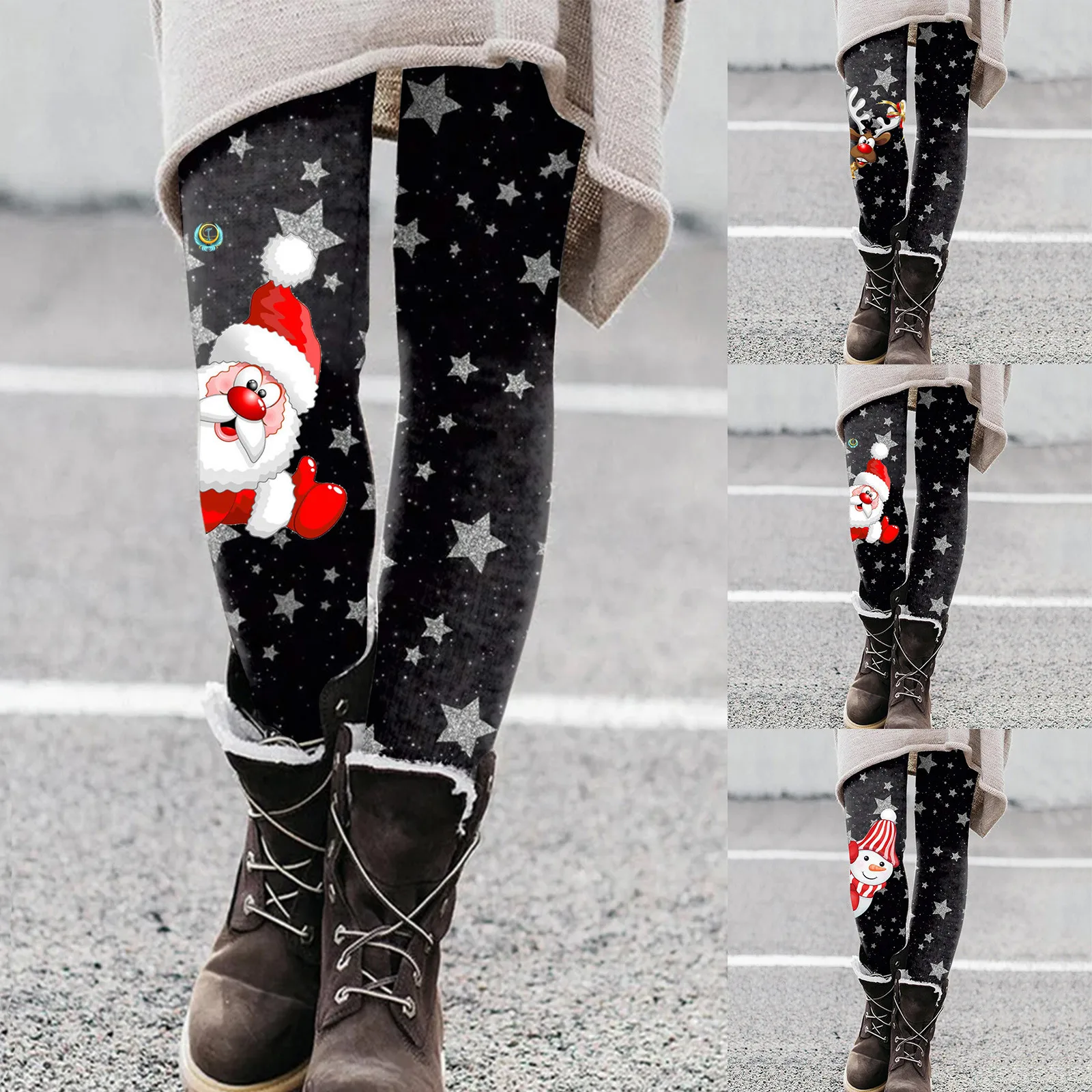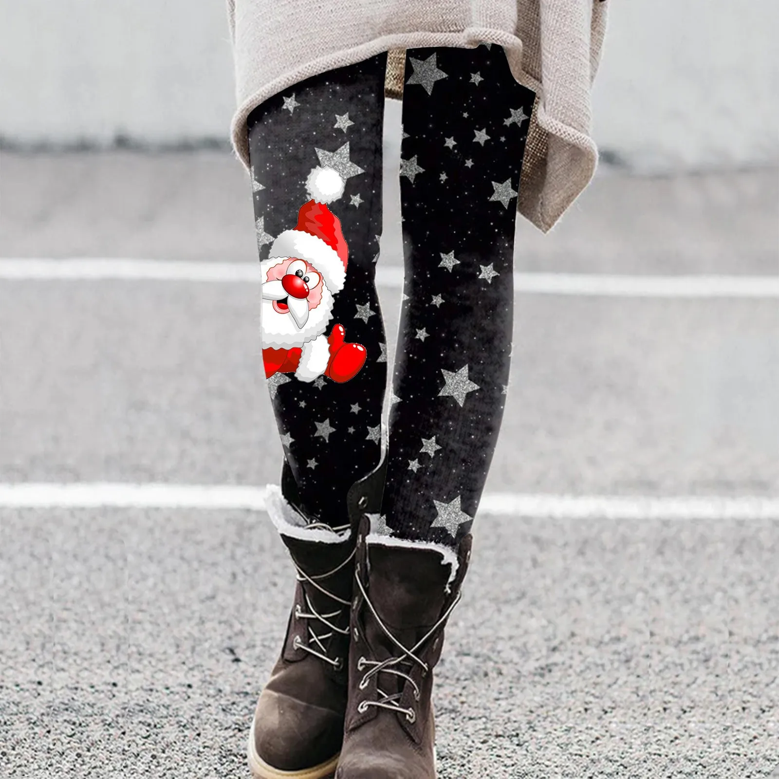 Women Casual Cute Christmas Cartoon Santa Print Inside Leggings Boots Pants High Waisted Straight Leg Winter Comfort Warm Wear
