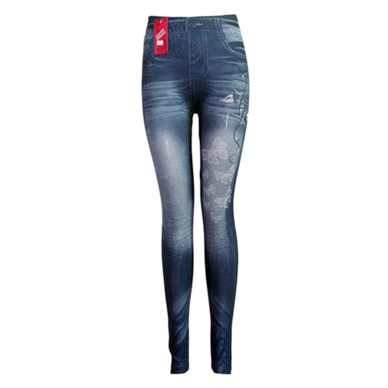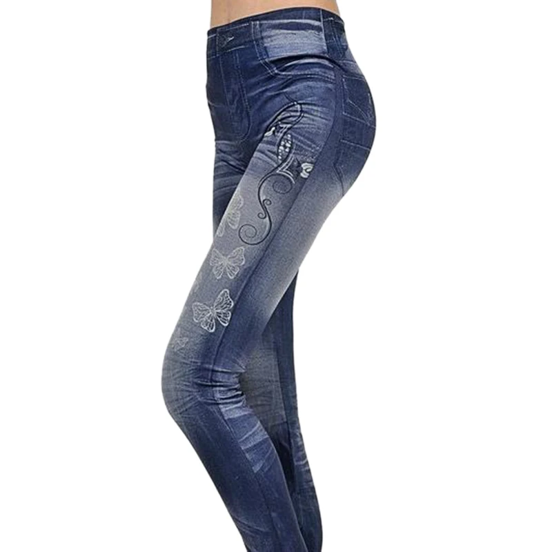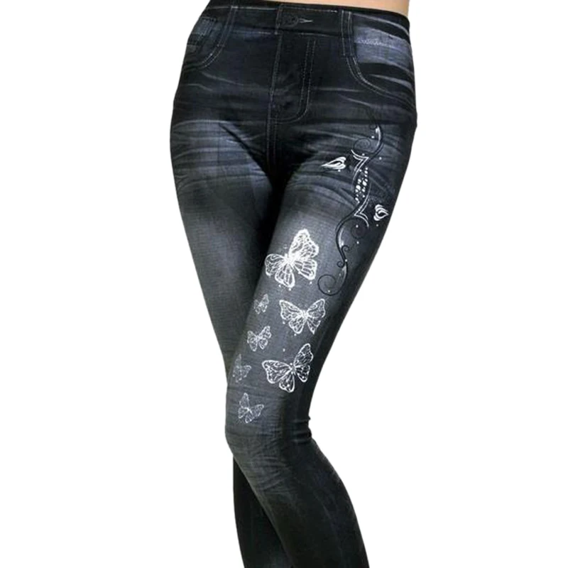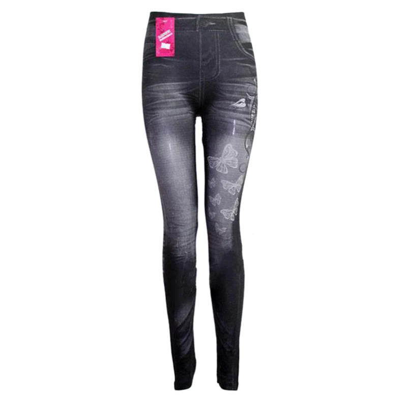 Fashion Faux Jean Legins Women Butterfly Print Blue Black High Waist Spandex Slim Leggings Woman Streetwear Pants Ropa Mujer