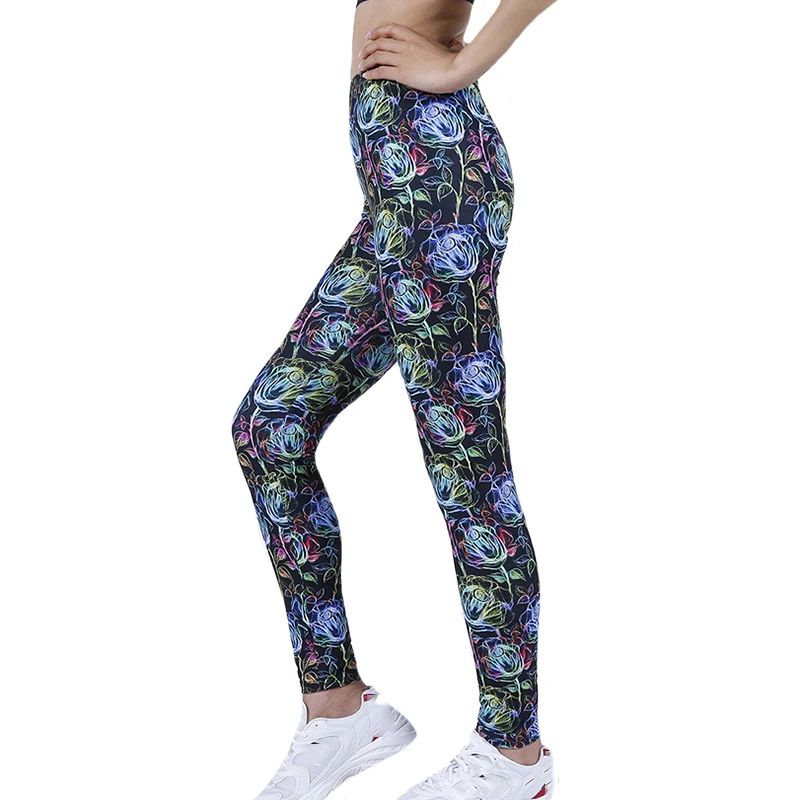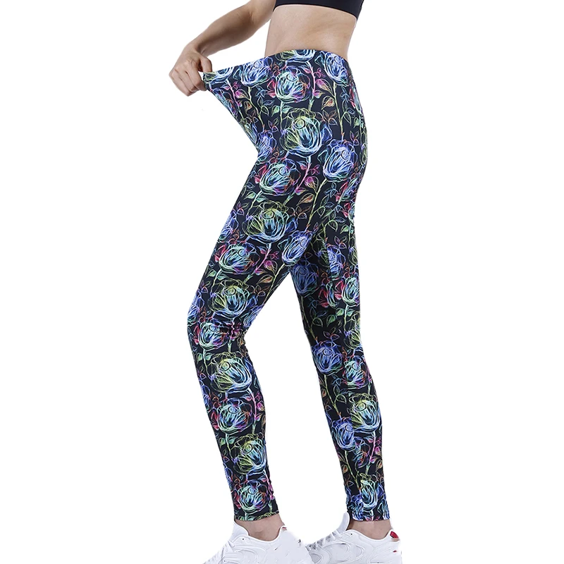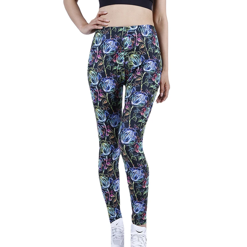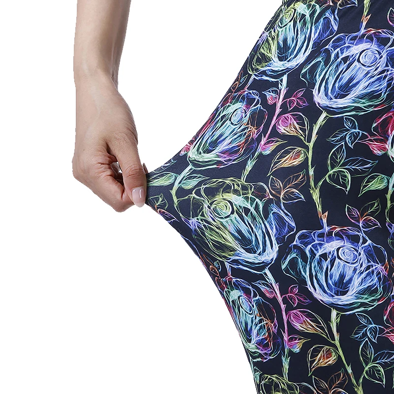 YSDNCHI Women Leggings Fashion Black Fluorescence Rose Print Leggins Fitness Activewear Workout Leggin Spandex High Elastic