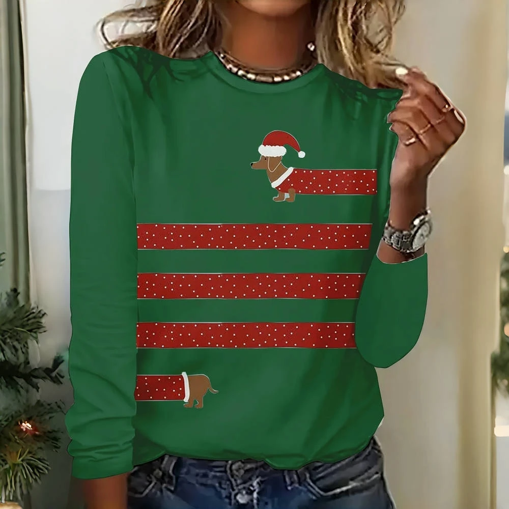 2024 New Women's Simple Striped T-Shirt Funny Christmas Dachshund Printed Long Sleeve T-Shirt Designer Clothing