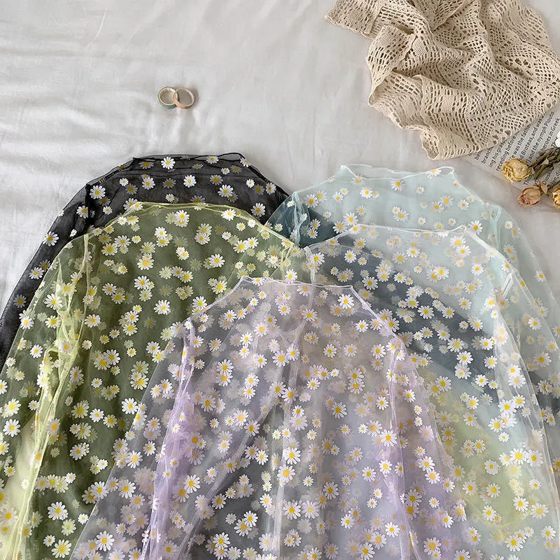 Floral Daisy Transparent Mesh Tops For Women Sexy Lace Long Sleeve Sheer Slim Ladies Turtleneck Tees Girls Sun-proof Tops Shirt