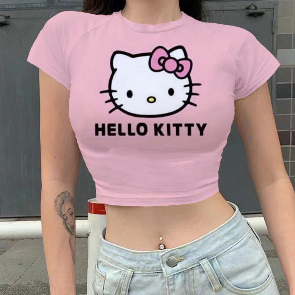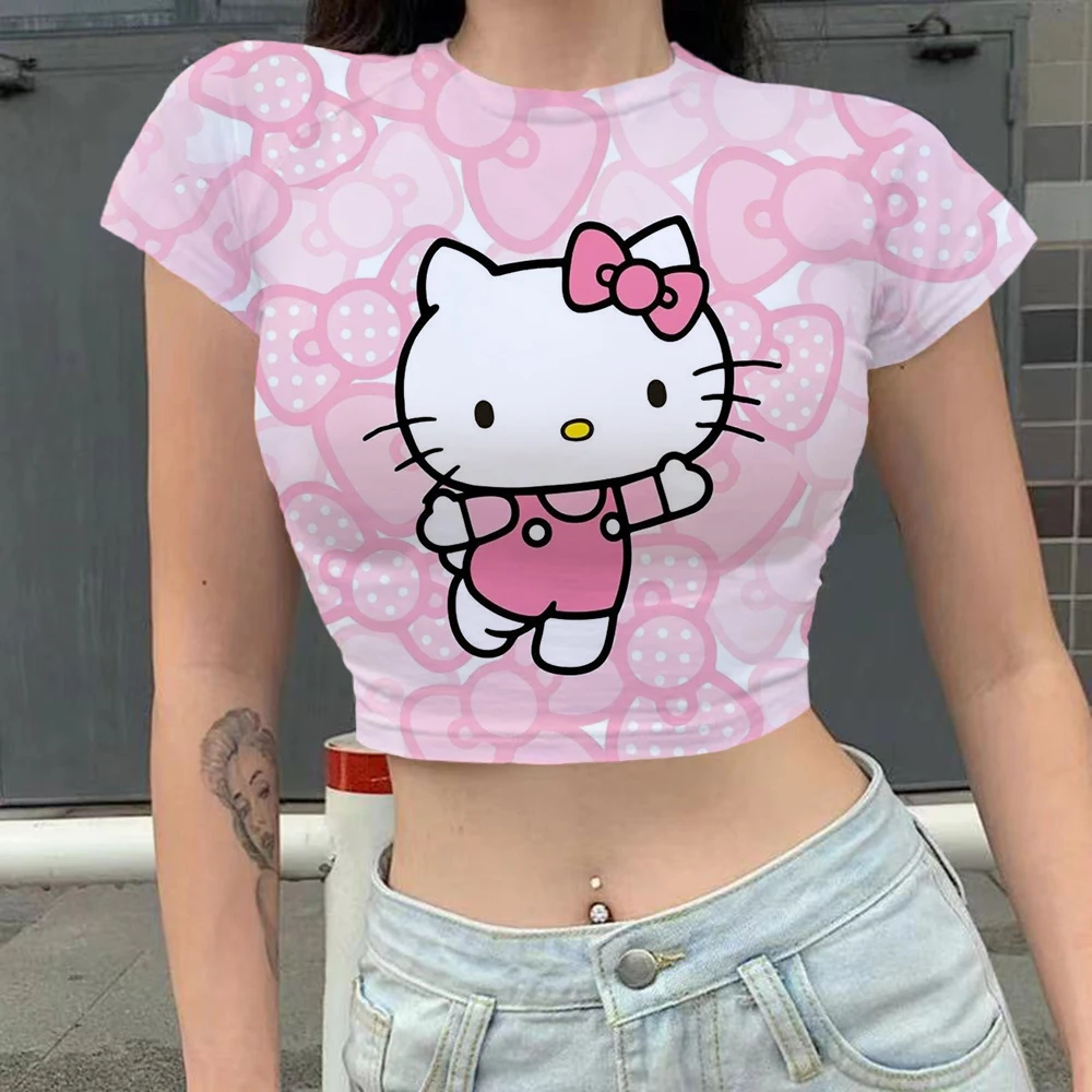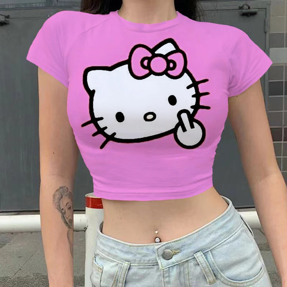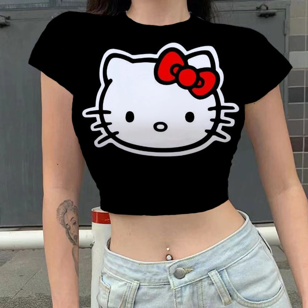 Summer Women Fashion Crop Sexy Y2K Top Shirt HELLO KITTY O-Neck Short Sleeve T-shirt Casual Tees Basic Cartoon printing T-shirt