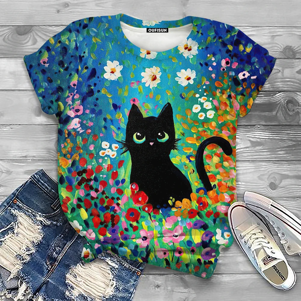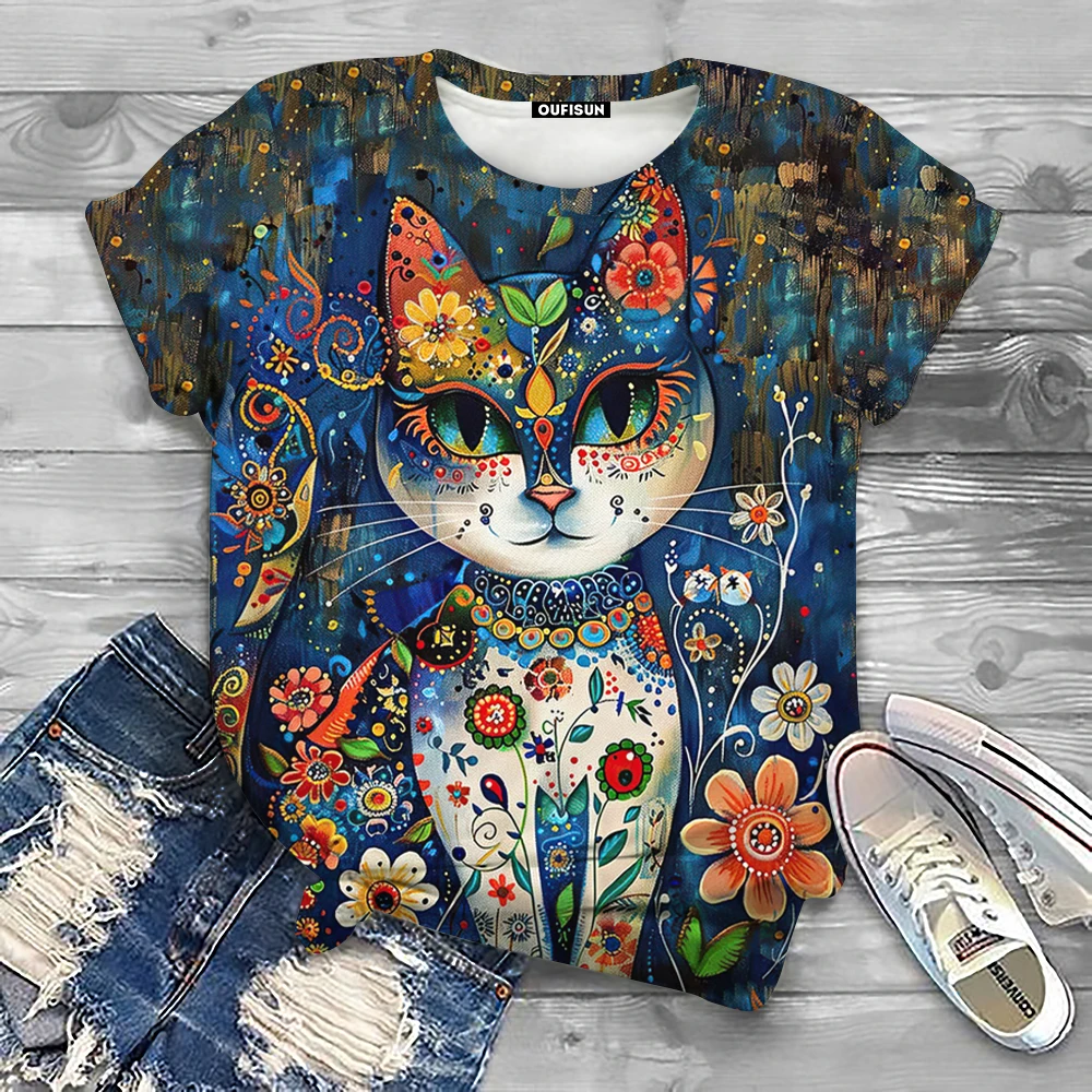 Cute Cat Printed Women's T-Shirt Summer O-Neck Short-Sleeve Tops Oversized Clothing Street Fashion Female T Shirt Pullover