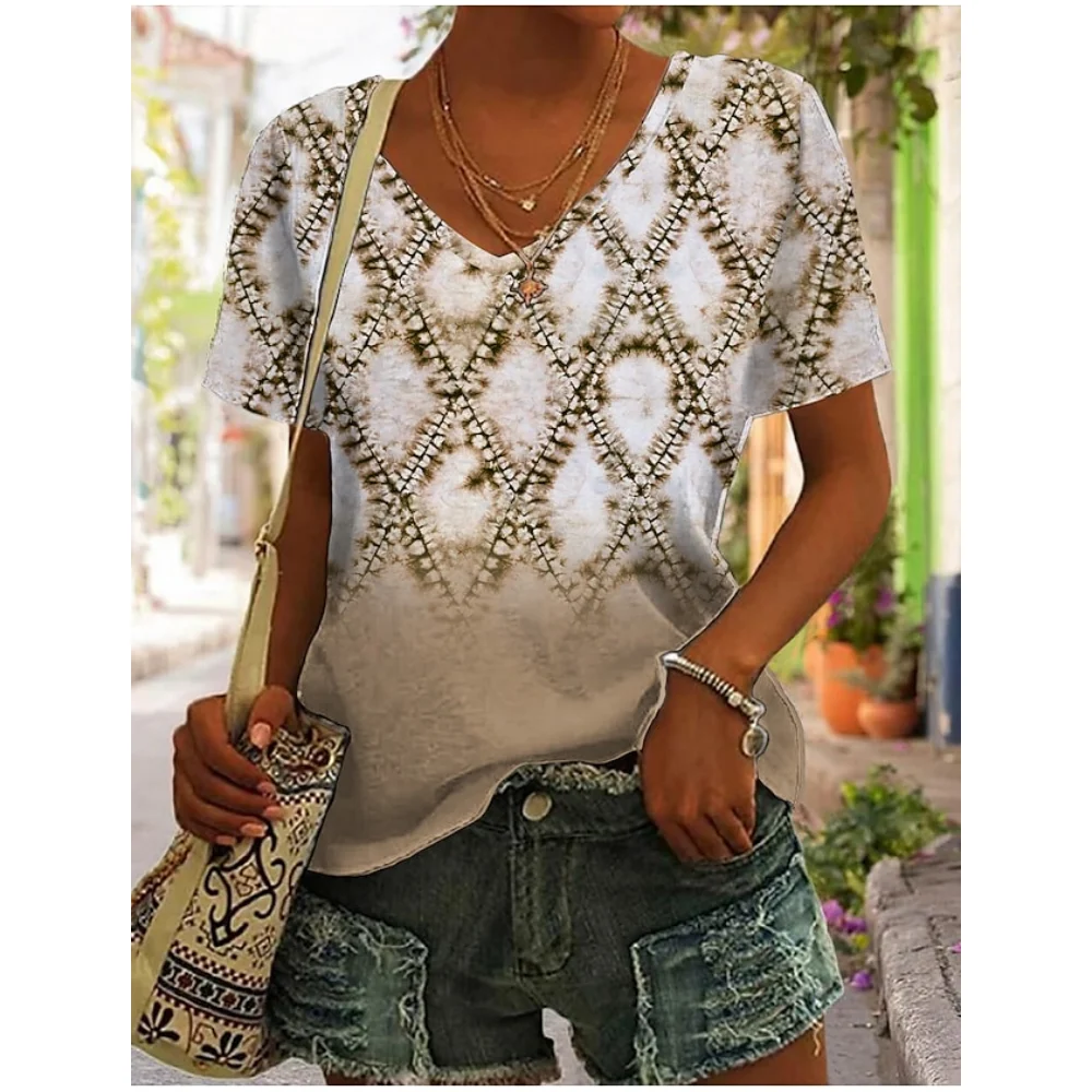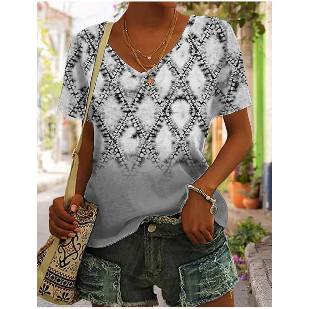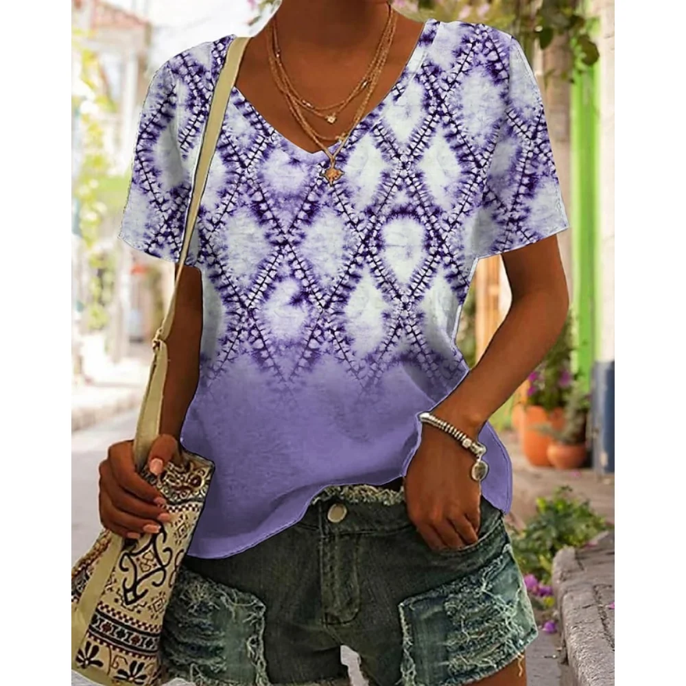 Fashion Women's T-shirt 3d Pink Blue Purple Plaid Print Tops Tee Daily Weekend Basic V Neck Female Clothes Summer Woman Clothing