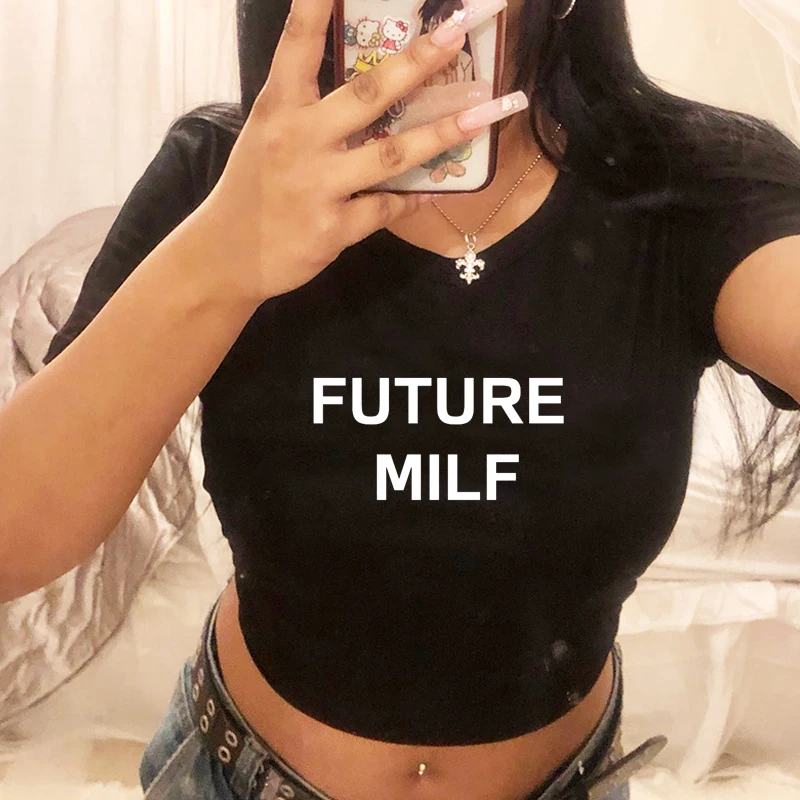 Future Milf Printed White Crop Tops Slim Sexy Baby Tee 0-Neck Y2k Vintage Harajuku Women T-Shirts Short Sleeve Summer Party Tee