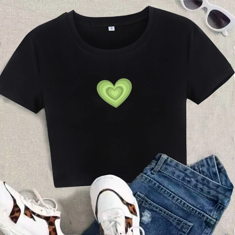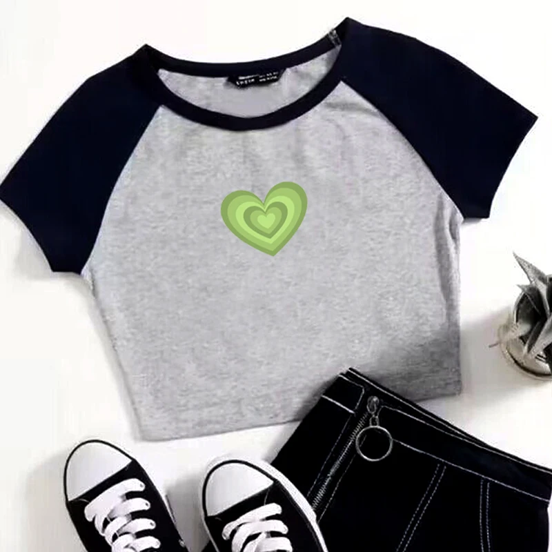 Women's T-Shirt Y2k Aesthetic Brown Heart Printed Vintage Patchwork Summer Crop Tops Sexy Baby Tee Teen Girls Casual Streetwear