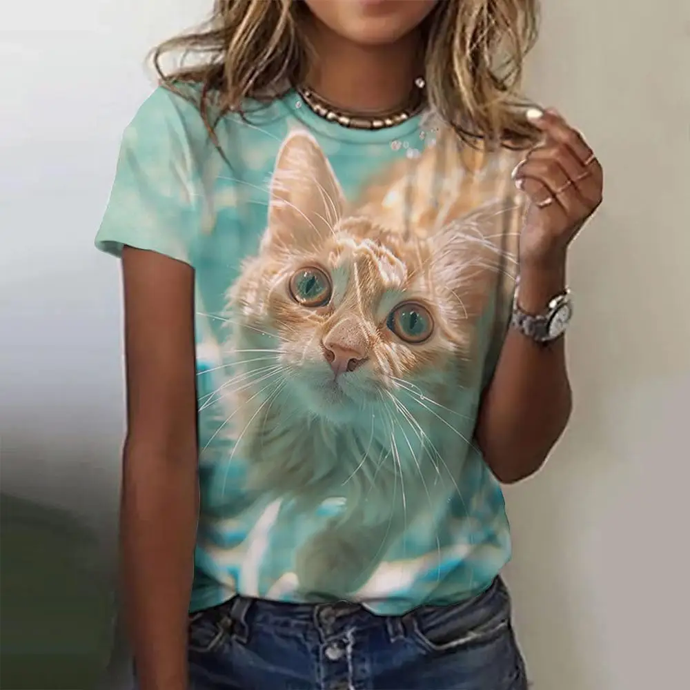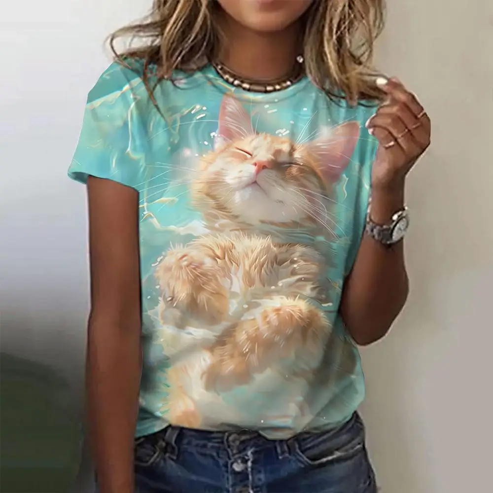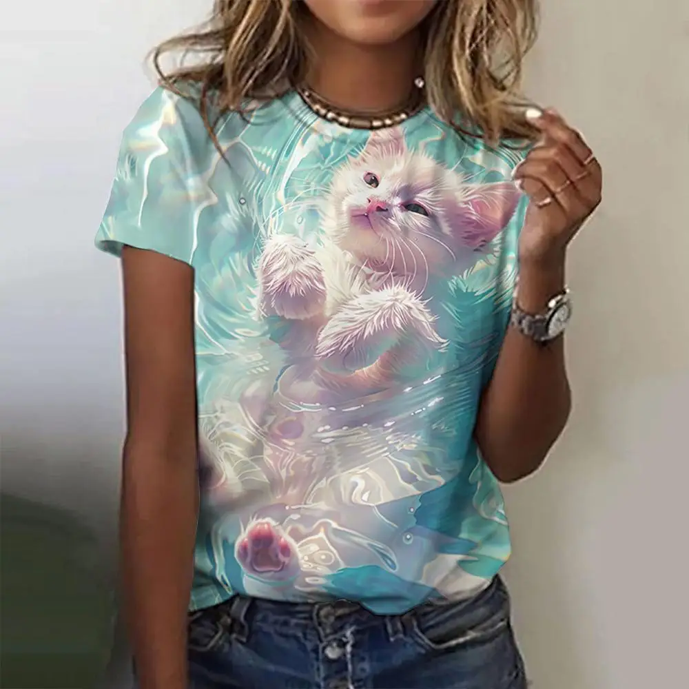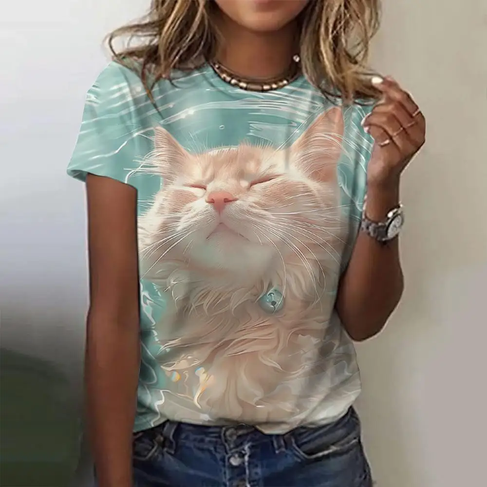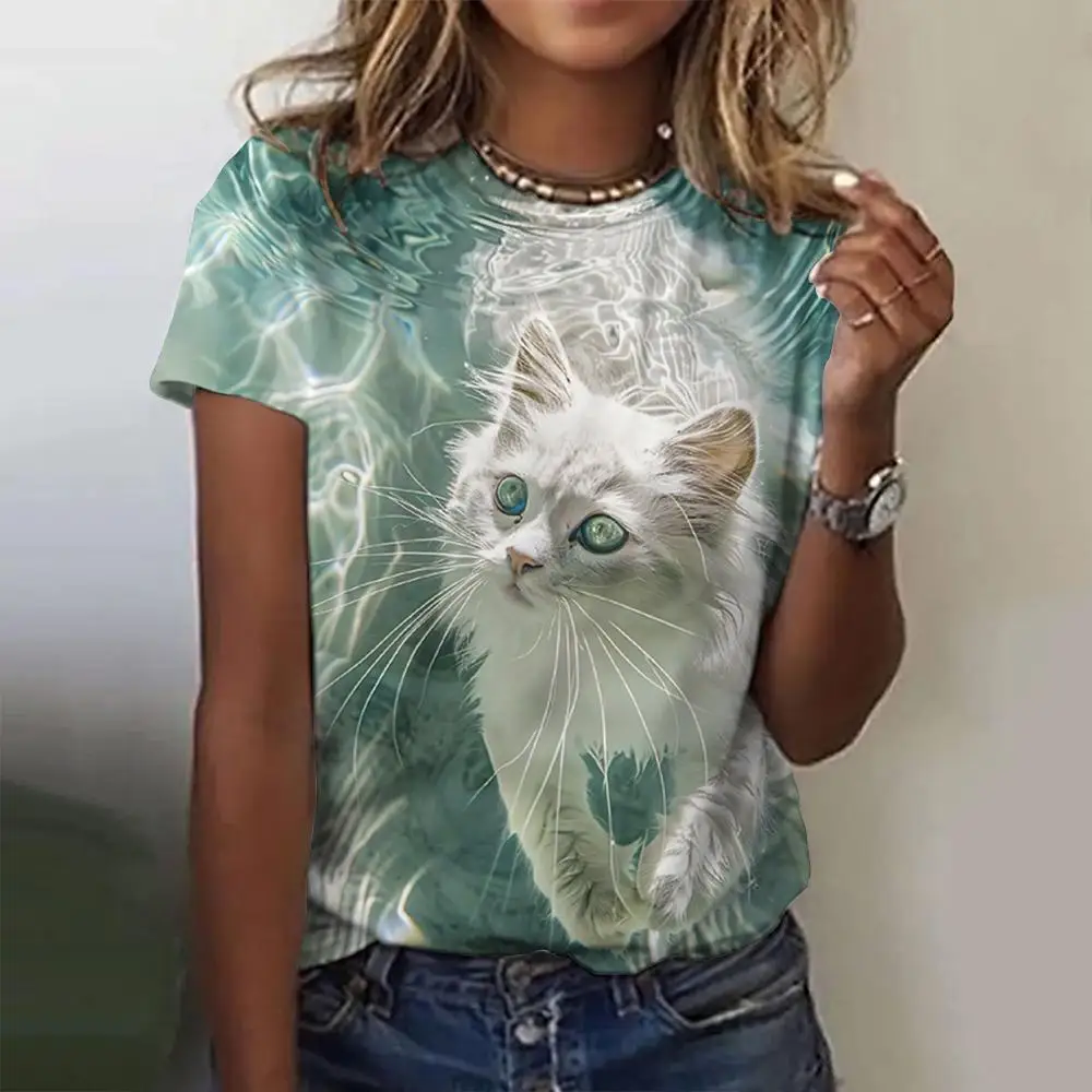 2024 Summer Round Neck Short Sleeve T-shirt Fashion 3D Printed Kitten Women's Top Fashion Pullover Casual Loose T-shirt