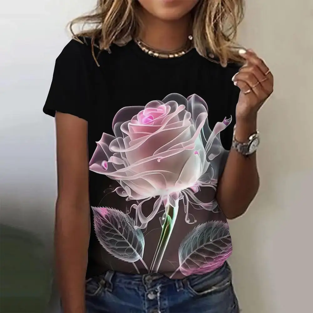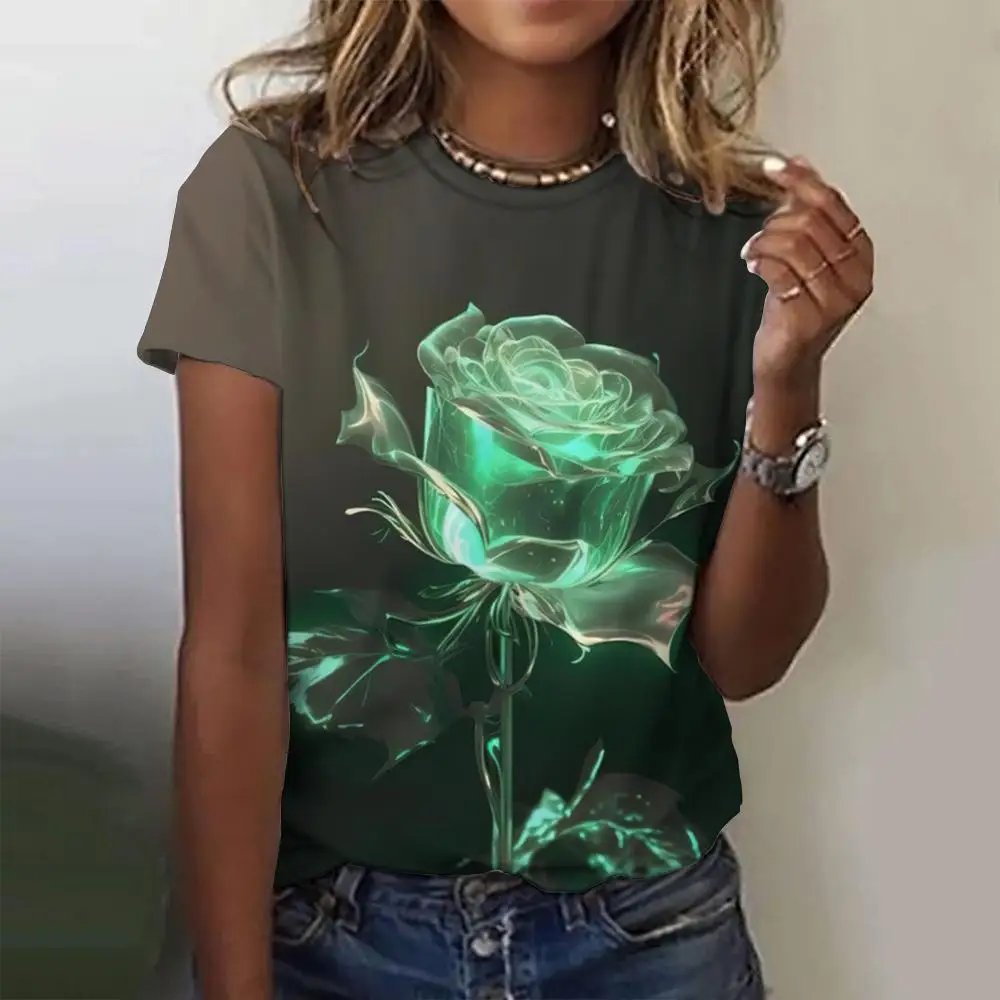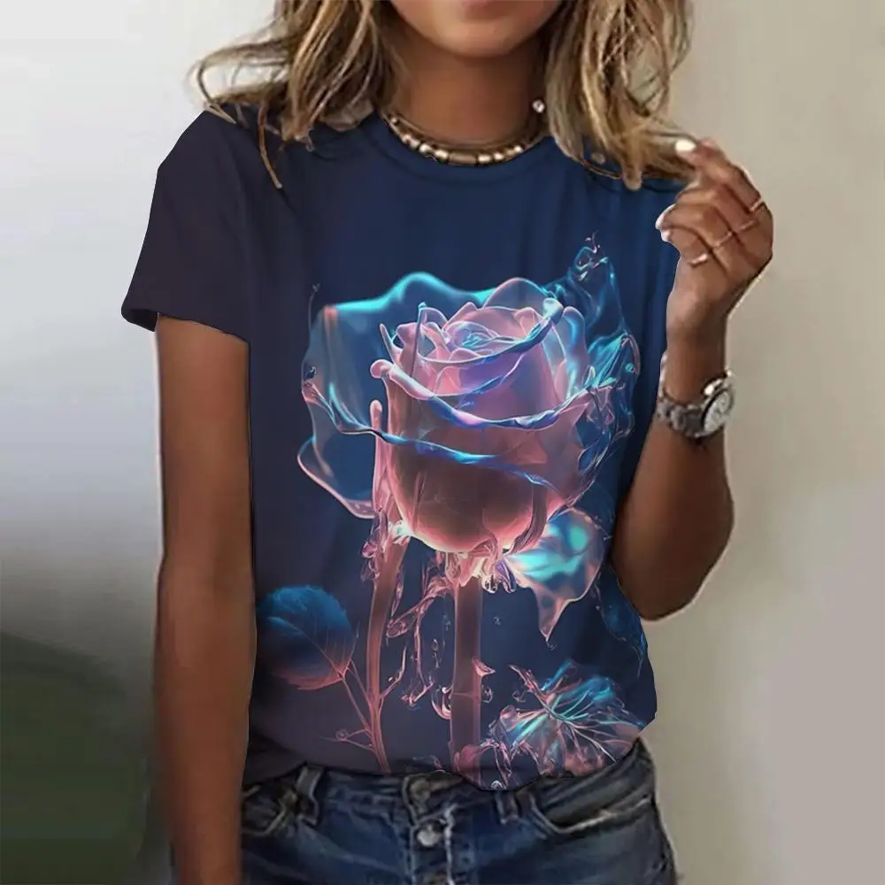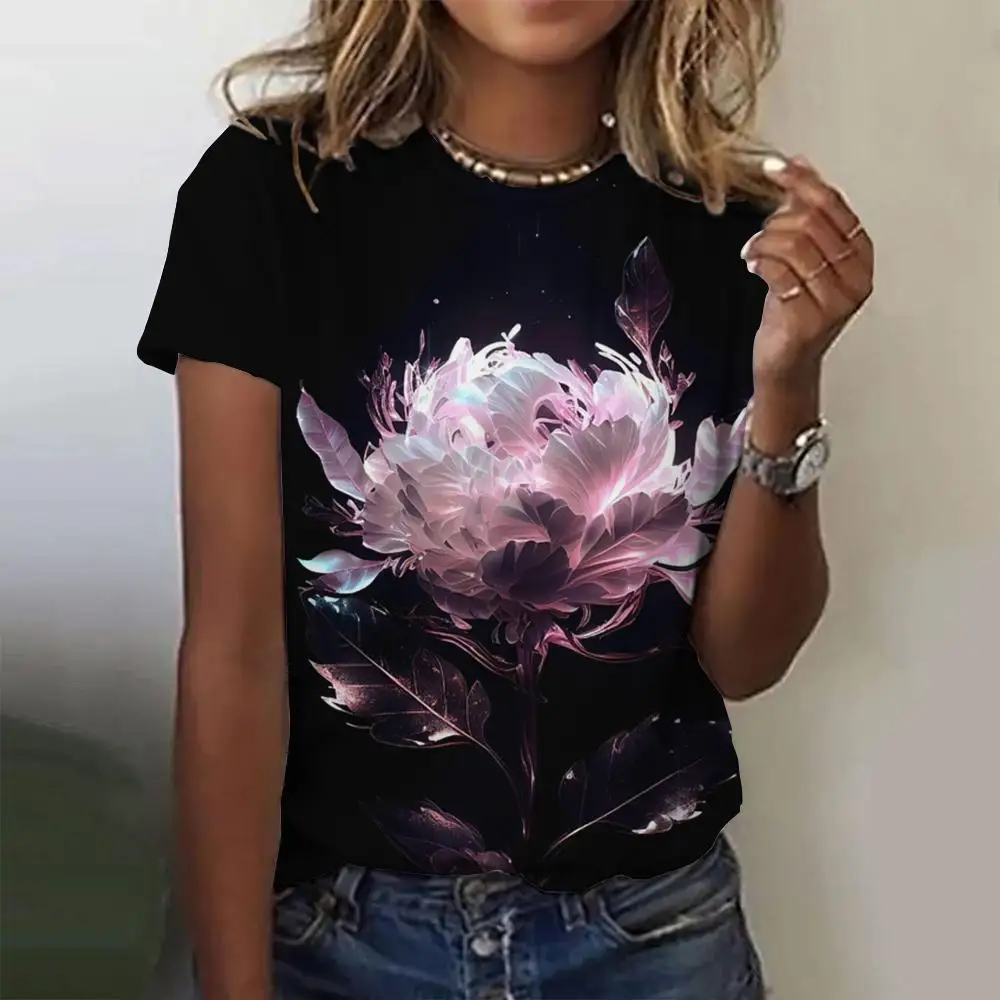 Summer Women's Printed Round Neck T-Shirt With Crystal Flower Pattern Top, Fashionable And Casual Loose Fitting Pullover