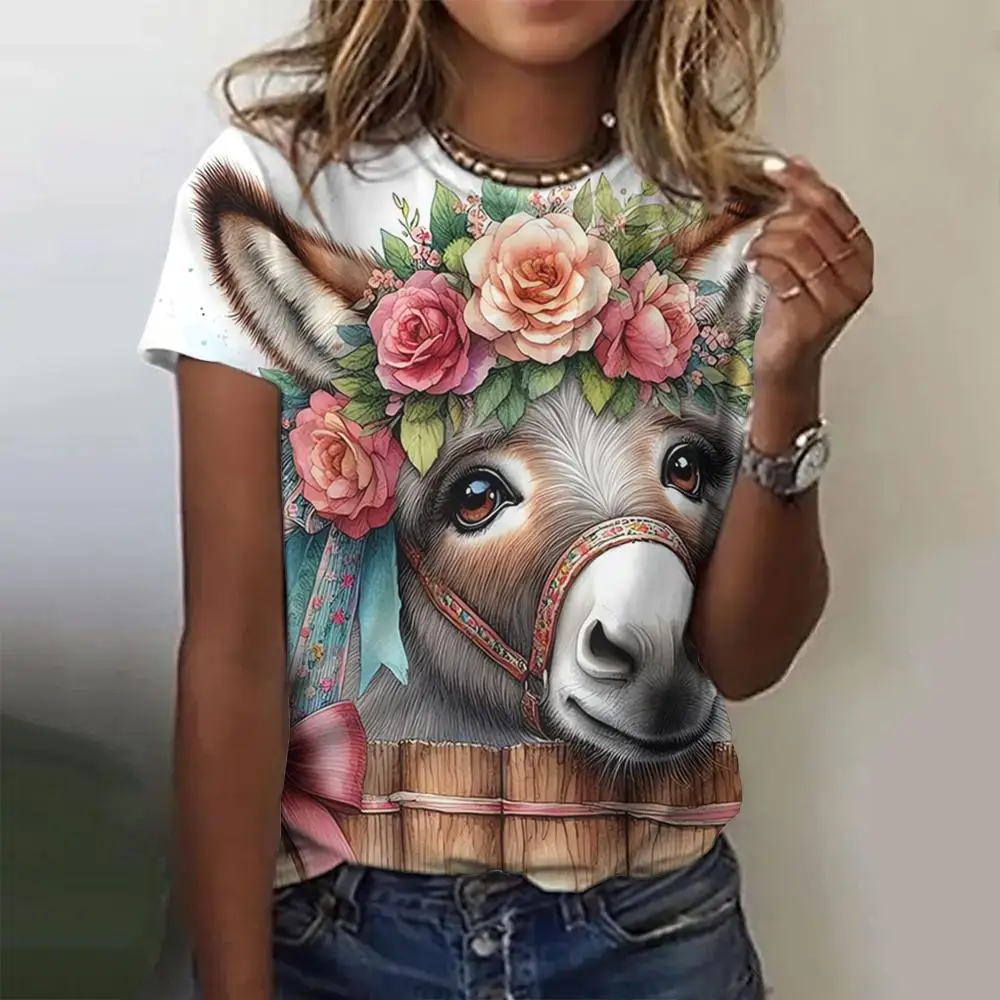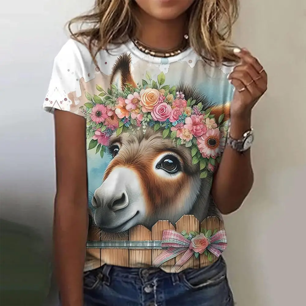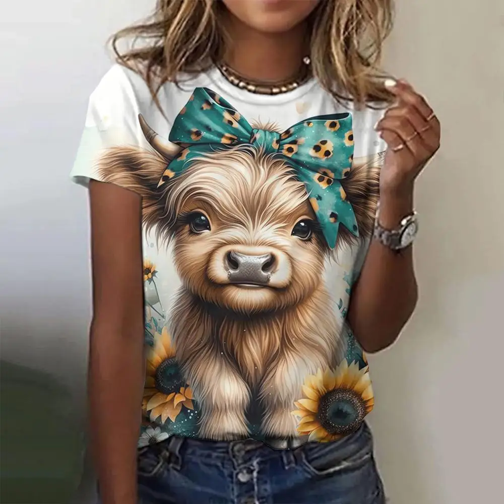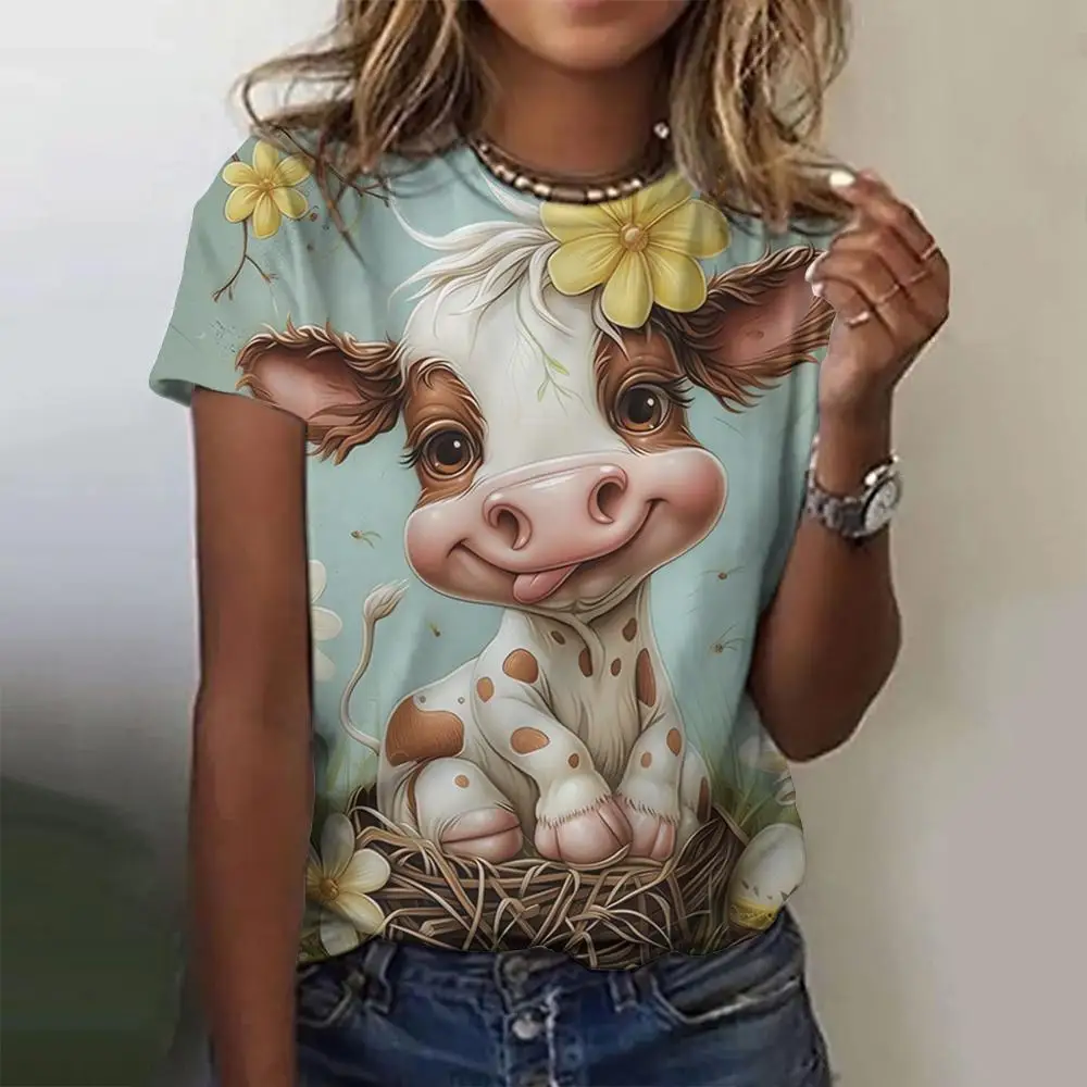 2024 Summer Clothing Basic Casual Top 3d Printed Women's Round Neck Small Animal Theme Cartoon Fashion T-Shirt