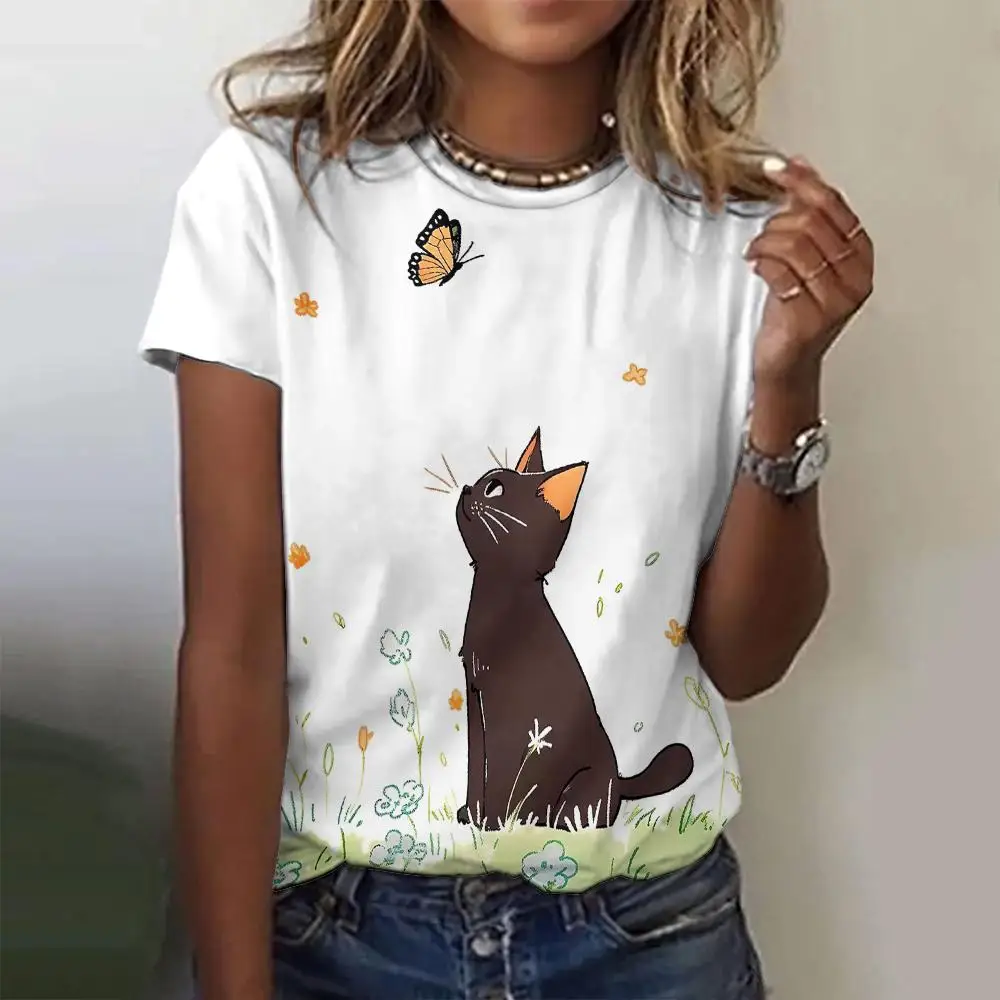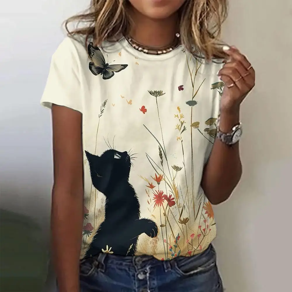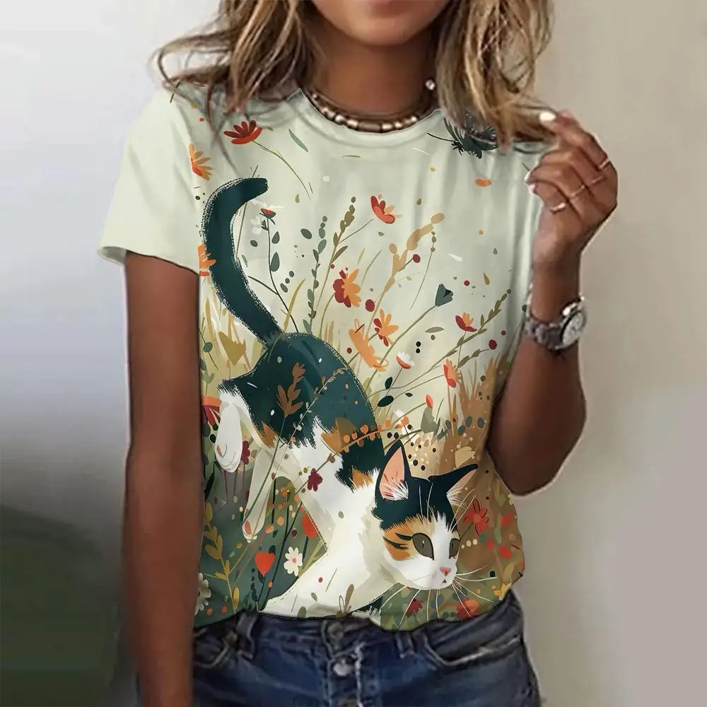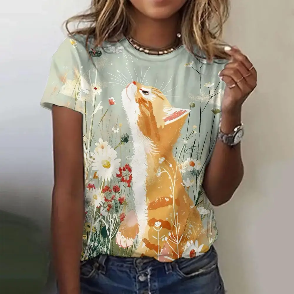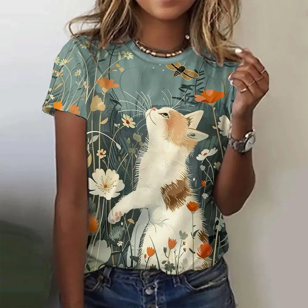 Summer Casual Women's Round Neck T-Shirt Casual Loose Retro Design Top Fashion 3d Printed Cat Pattern Women's T-Shirt