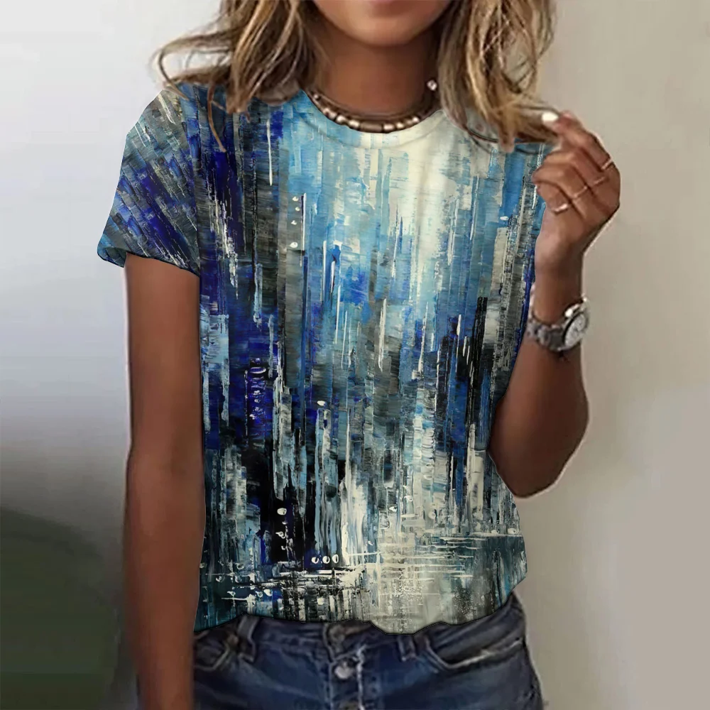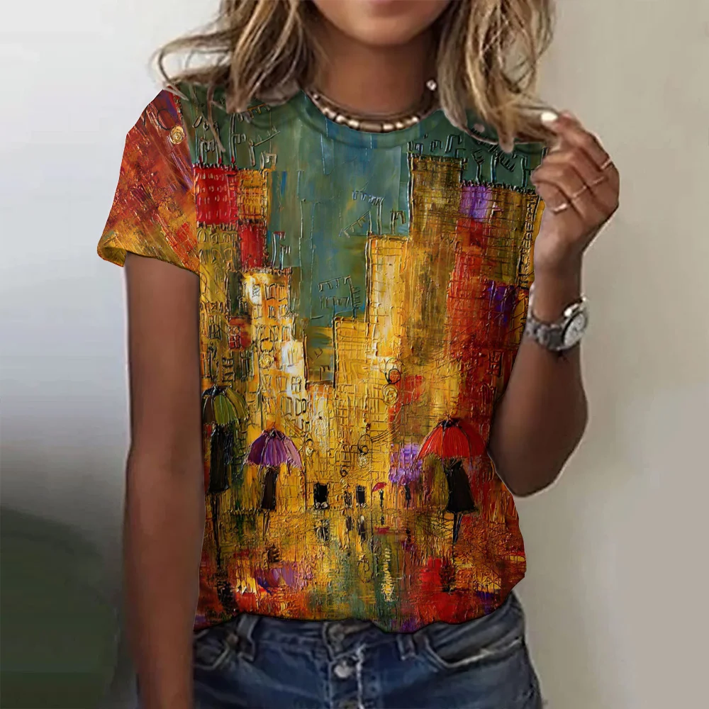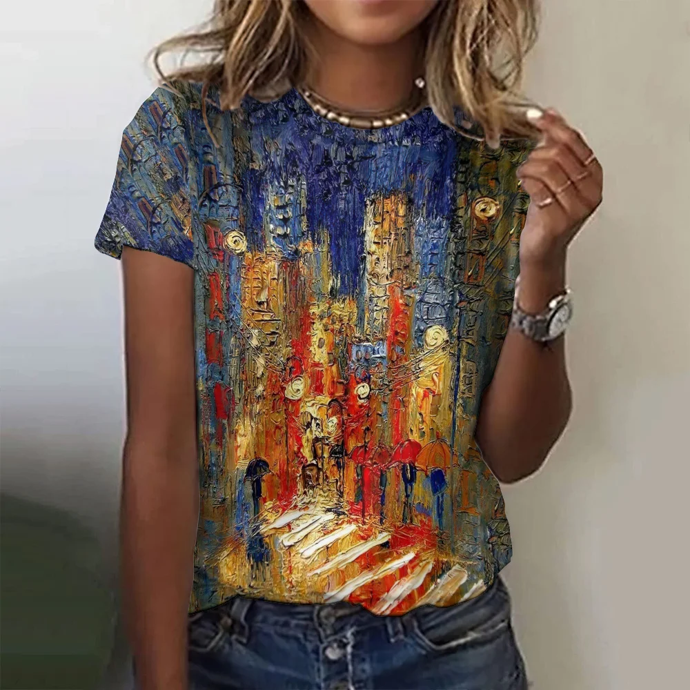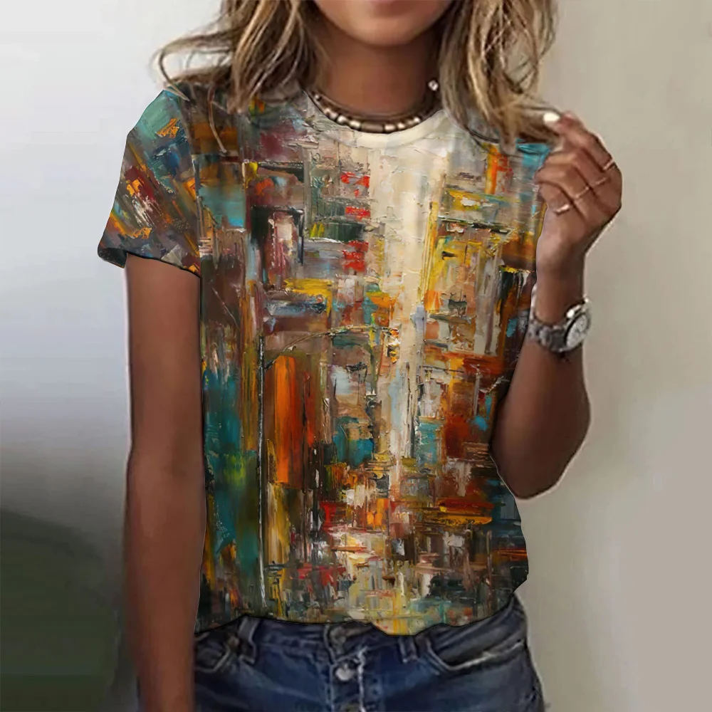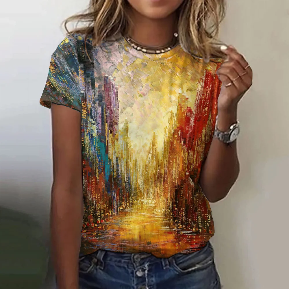 2024 Oil Painting Pattern Women's T-Shirt Fashionable Casual Colorful Round Neck Top Street Comfortable Loose T Shirt