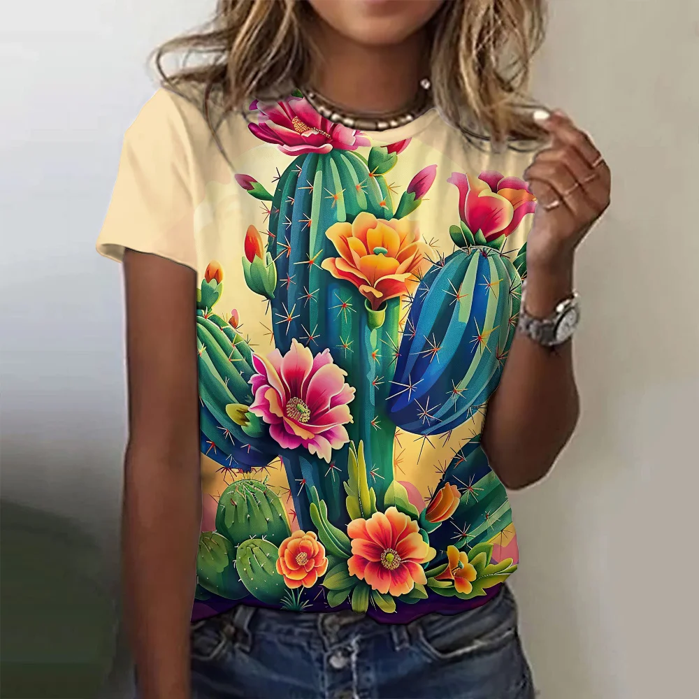 Summer 3d Printed Cartoon Loose Edition T-Shirt Fashion Cactus Pattern Top T-Shirt Round Neck Short Sleeve Women's Top