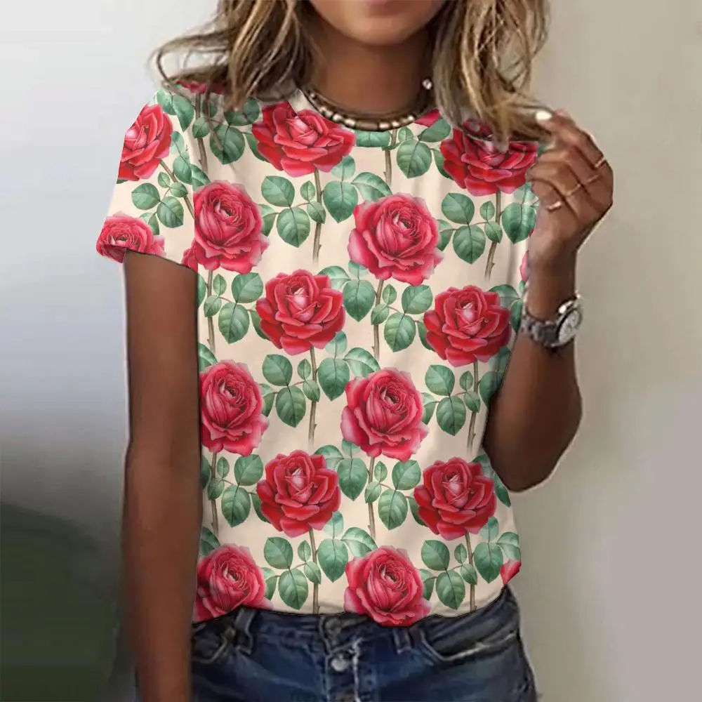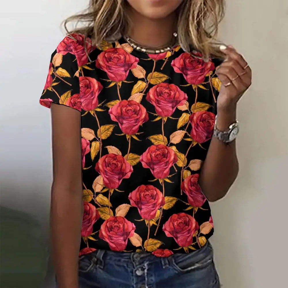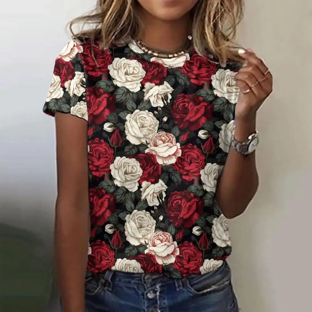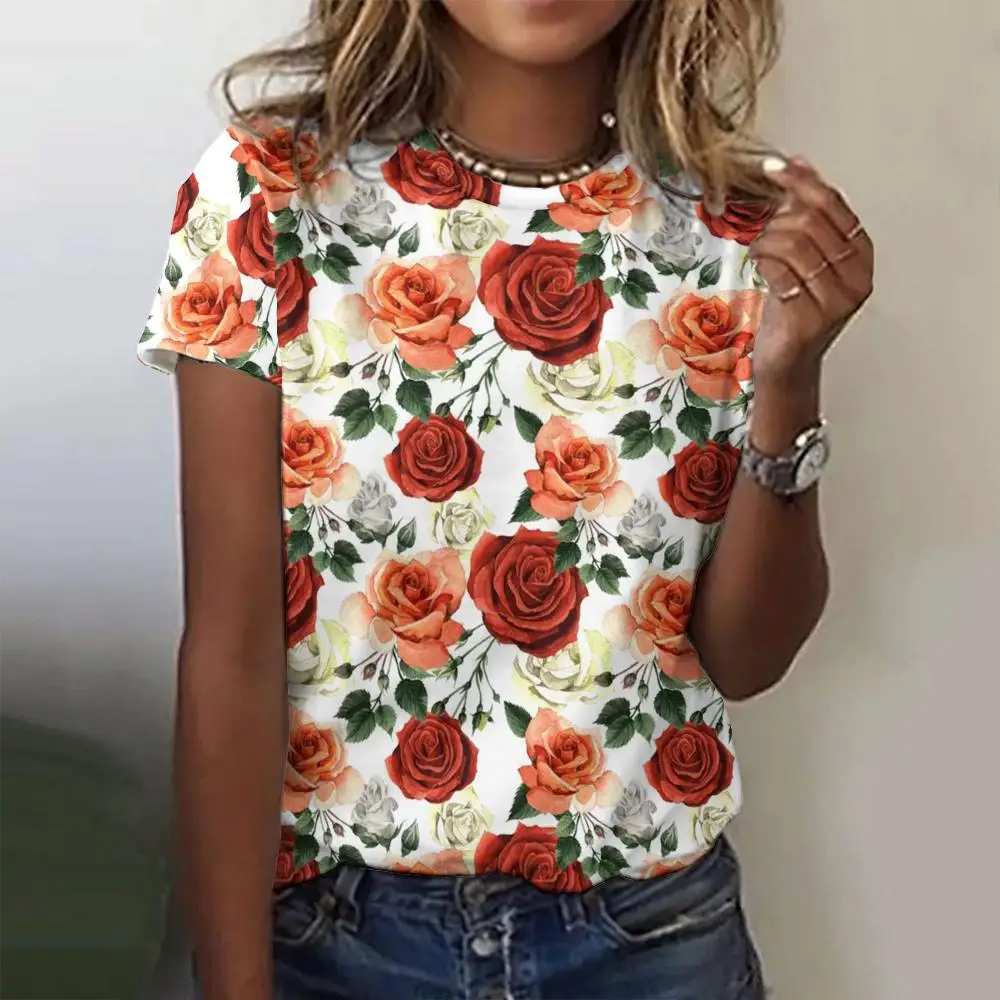 Summer Loose Women's T-Shirt Fashionable Printed Flower Pattern Top Street Casual Round Neck Short Sleeved T-Shirt 2024