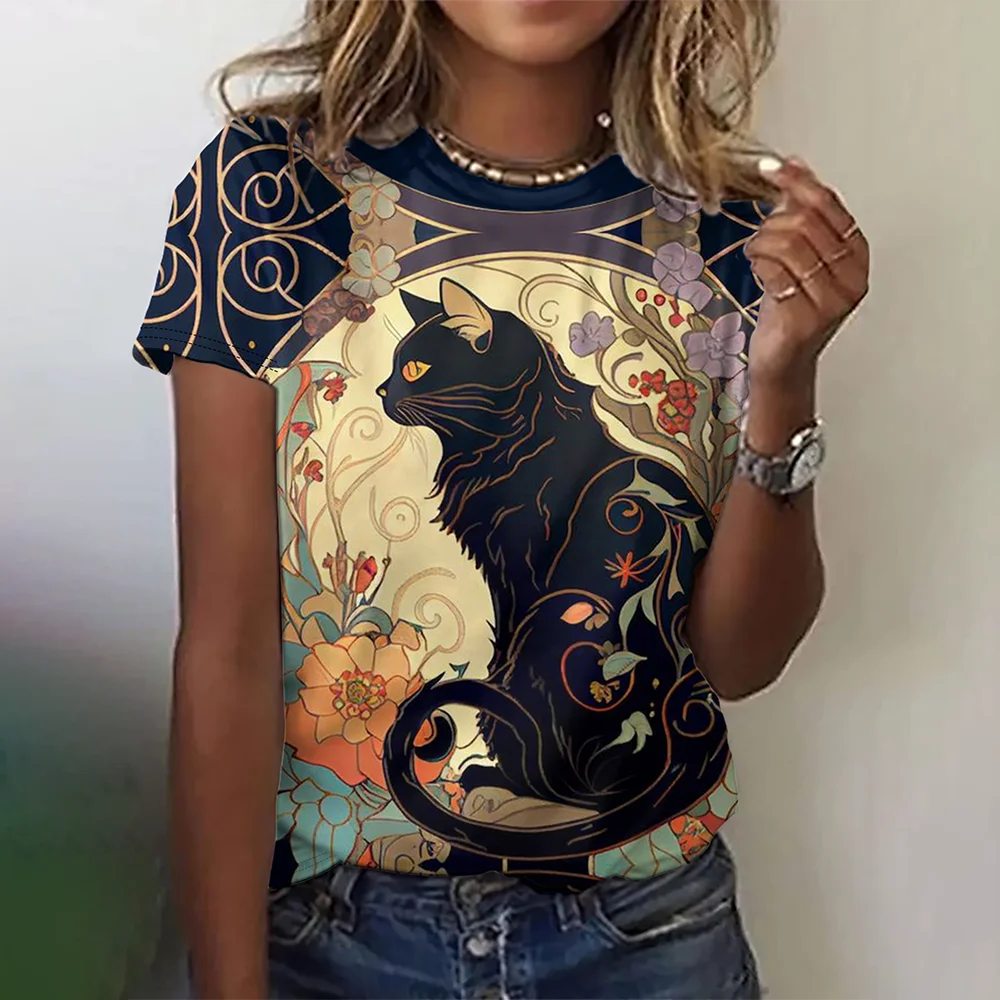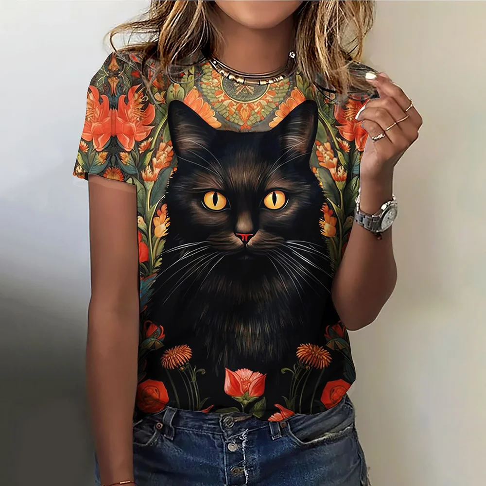 Summer O-Neck Short Sleeve Women's T-Shirt 3d Printed Black Cat Pattern T-Shirt Pullover Top Fashion Street Female Clothing 2024