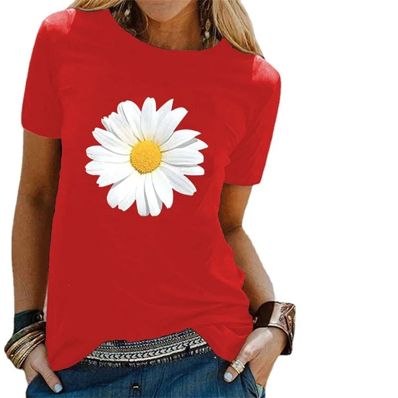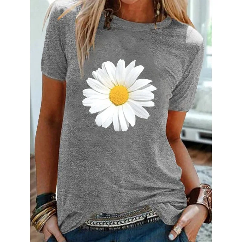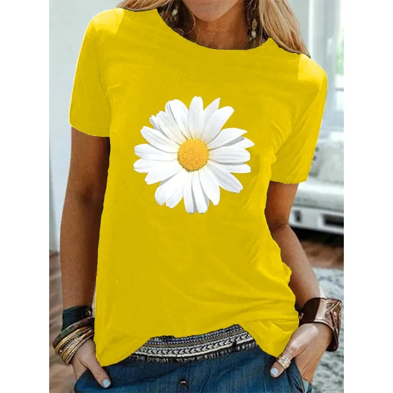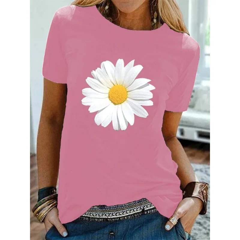 Cotton 100% Women's Round-neck Daisy Print Short-sleeved T-shirt for Women Harajuku Aesthetic Clothes Graphic T Shirts Tops