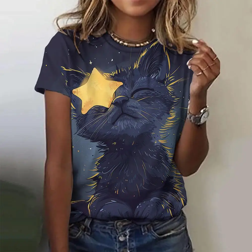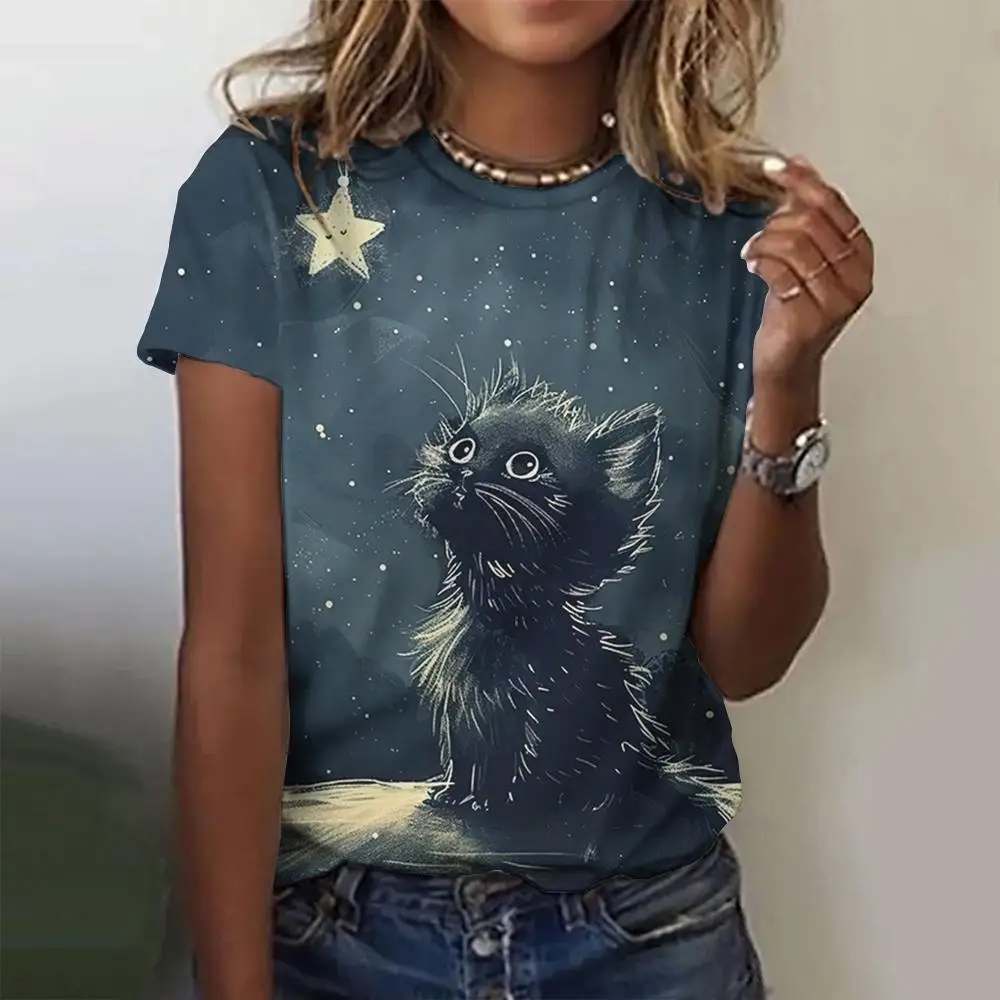 Summer Printed Cartoon Black Cat Pattern Women's T-shirt Fashion Casual Loose Top Round Neck Oversized Short Sleeve T-shirt