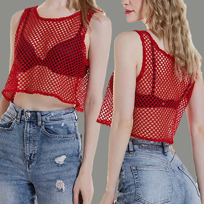 Sexy Black/Red Hollow Out Crop Top 2024 Mesh T-shirt Female Loose Fashion Summer Basic Tops For Women Fishnet Shirt